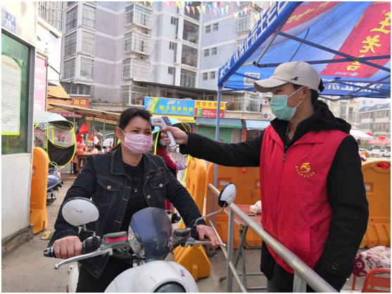 石化学院学生在社区担任志愿者为进出人员测量体温