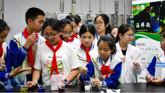 在化工实验中心,大学生志愿者带领同学们体验了“掌中火”“彩虹分层”等安全有趣的化学实验,通过沉浸式体验,抽象的化学原理变成了触手可及的奇妙现象。