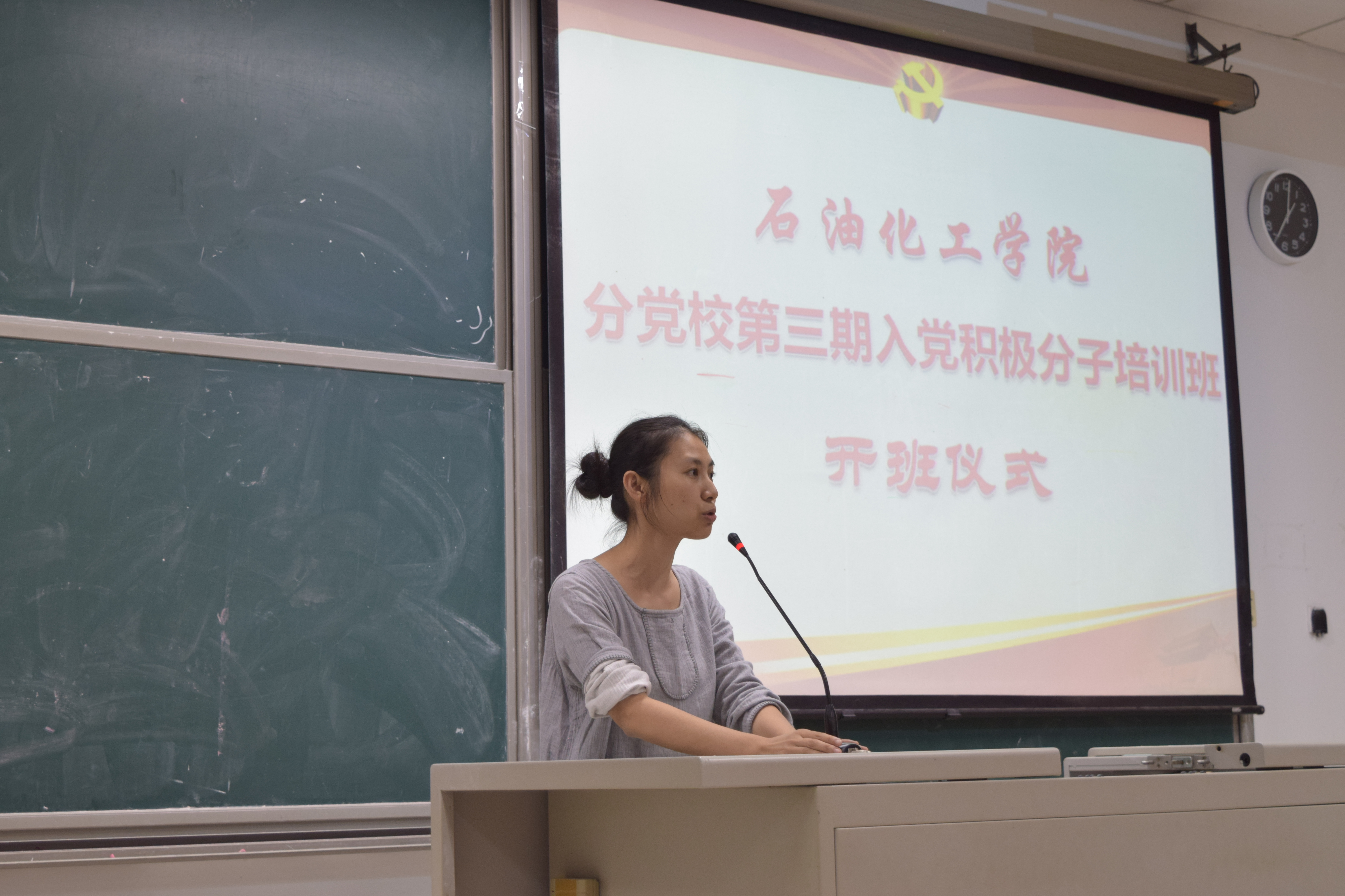 2016年11月7日晚,石油化工学院分党校第三期入党积极分子培训班开班仪式在文二-205顺利举行。此次培训由校组织部柯江锋老师主讲,院团委书记蒋林娟老师主持。旨在端正积极分子入党动机,未进党的门,先做党的人。