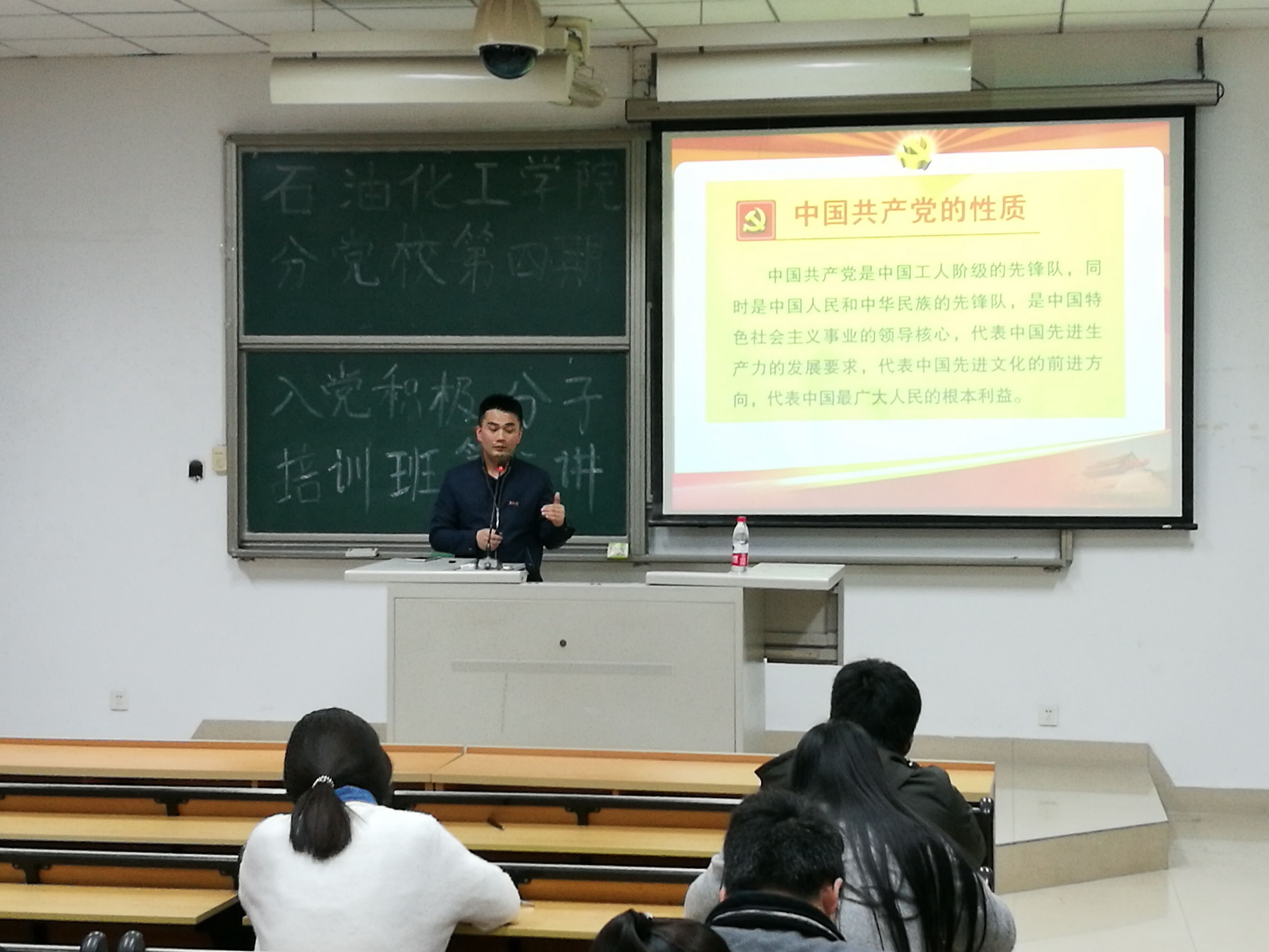 2017年3月27日晚,以“学习党章,坚定理想信念”为主题的石油化工学院分党校第四期入党积极分子培训班第四讲在文一-205顺利举行。此次培训由校组织部柯江锋老师主讲,旨在加强积极分子对党章的认识,深入解读党章知识。