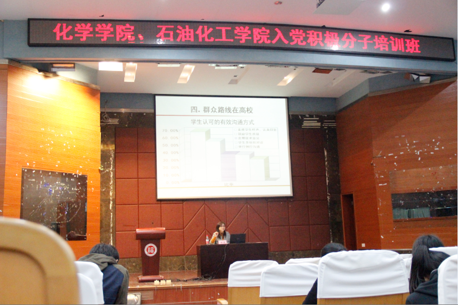 2014年12月4日晚,石油化工学院分党校入党积极分子培训班第3次讲座在嘉锡厅举行。本次讲座由石油化工学院党委副书记刘玮主讲。