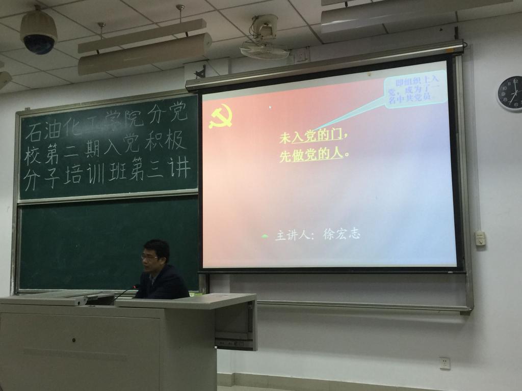 2015年11月16日晚,以“未入党的门,先做党的人”为主题的石油化工学院分党校第二期入党积极分子培训班第三讲在文二-203顺利进行。此次培训由校组织部徐宏志副部长主讲。本次讲座旨在端正积极分子的入党动机,未进党的门,先做党的人。