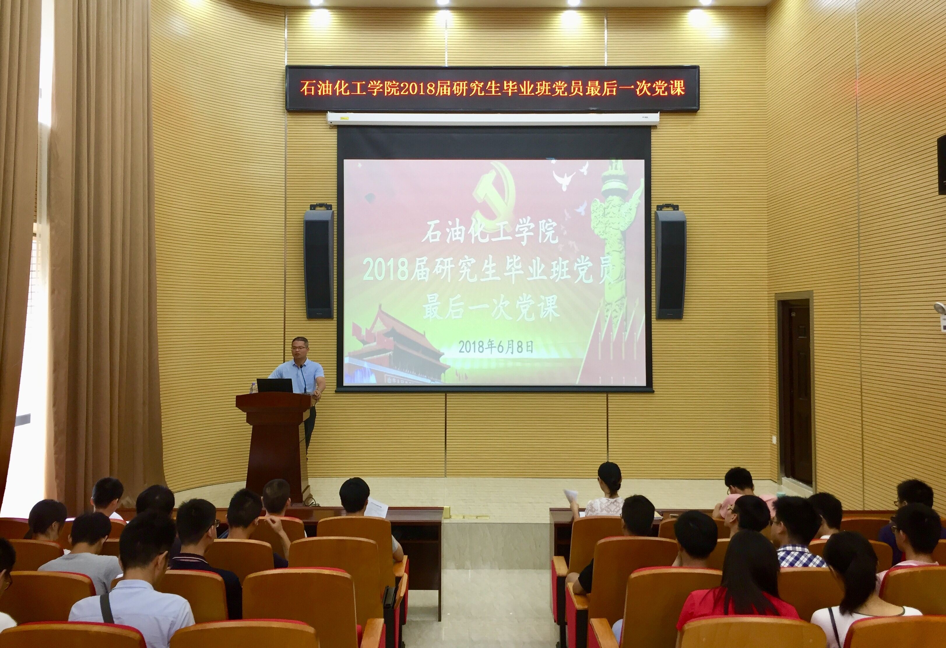 6月8日上午九点半,石油化工学院 2018届研究生毕业班党员最后一次党课在泉港楼一楼报告厅开讲,2018届41名党员全部到会,院党委副书记岳志强老师为研究生毕业生上了离校前的最后一堂党课。