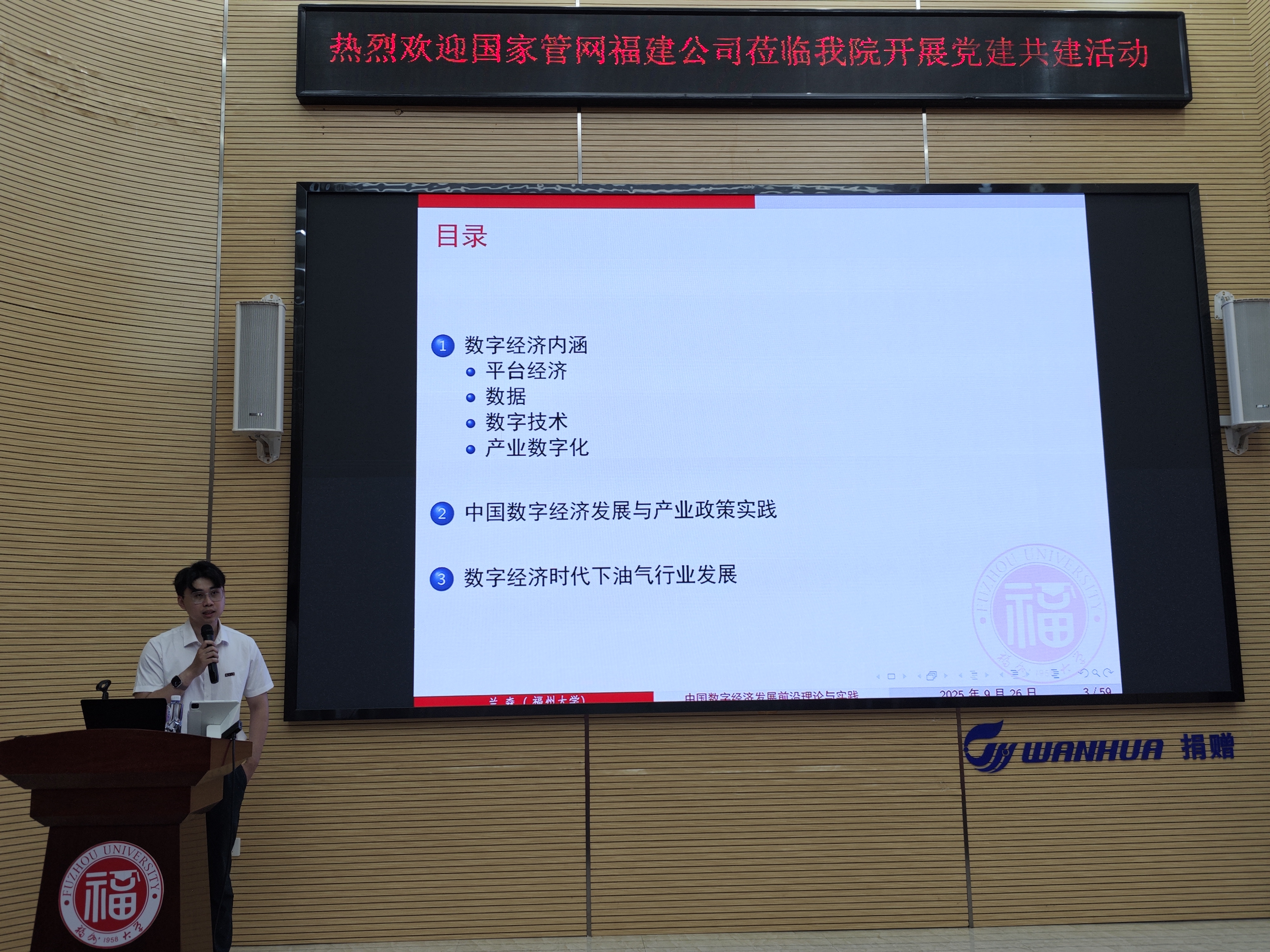 经管学院兰森副教授为党员们讲述题为《中国数字经济发展前沿理论与实践》的专题讲座,从数字经济核心理论、国内数字经济实践案例、数字经济对油气行业、高校相关学科的发展启示等方面展开了精彩的分析和阐述。