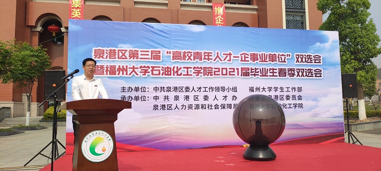泉港区委常委、组织部部长彭垂鼎代表泉港区向各企业代表的到来表示热烈欢迎,并表达泉港区委区政府求贤若渴,广纳良才的诚意,希望广大毕业生能够选择泉港、扎根泉港、奉献泉港,为泉港的石化行业奉献力量。