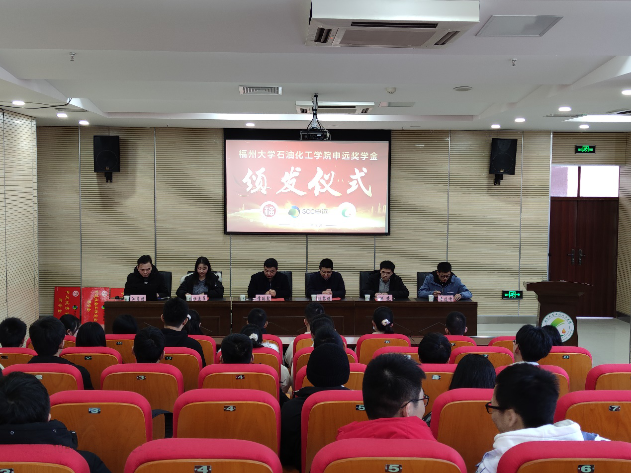 石油化工学院2020年申远奖学金颁发仪式在泉港校区报告厅举行。恒申集团人才吸引和发展中心经理陈黎铭先生、杜逸萍女士,学院常务副院长侯琳熙教授、学院团委副书记何杰老师以及各年级辅导员出席了颁发仪式。奖学金颁发仪式由2017级辅导员江良煊主持。