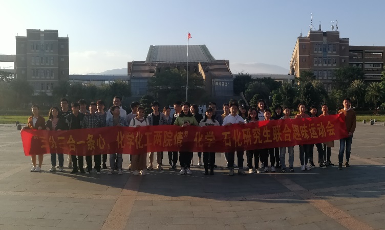 为进一步丰富广大学生的校园生活,增进社团之间的感情,构筑和谐的校园生活,促进社团间的友好与团结。2019年12月1日下午2:00由石油化工学院和化学学院联合举办以“三分三合一条心,化学化工两院情”为主题的化学-石化研究生联合趣味运动会在福大旗山校区教学区图书馆及其周边展开。