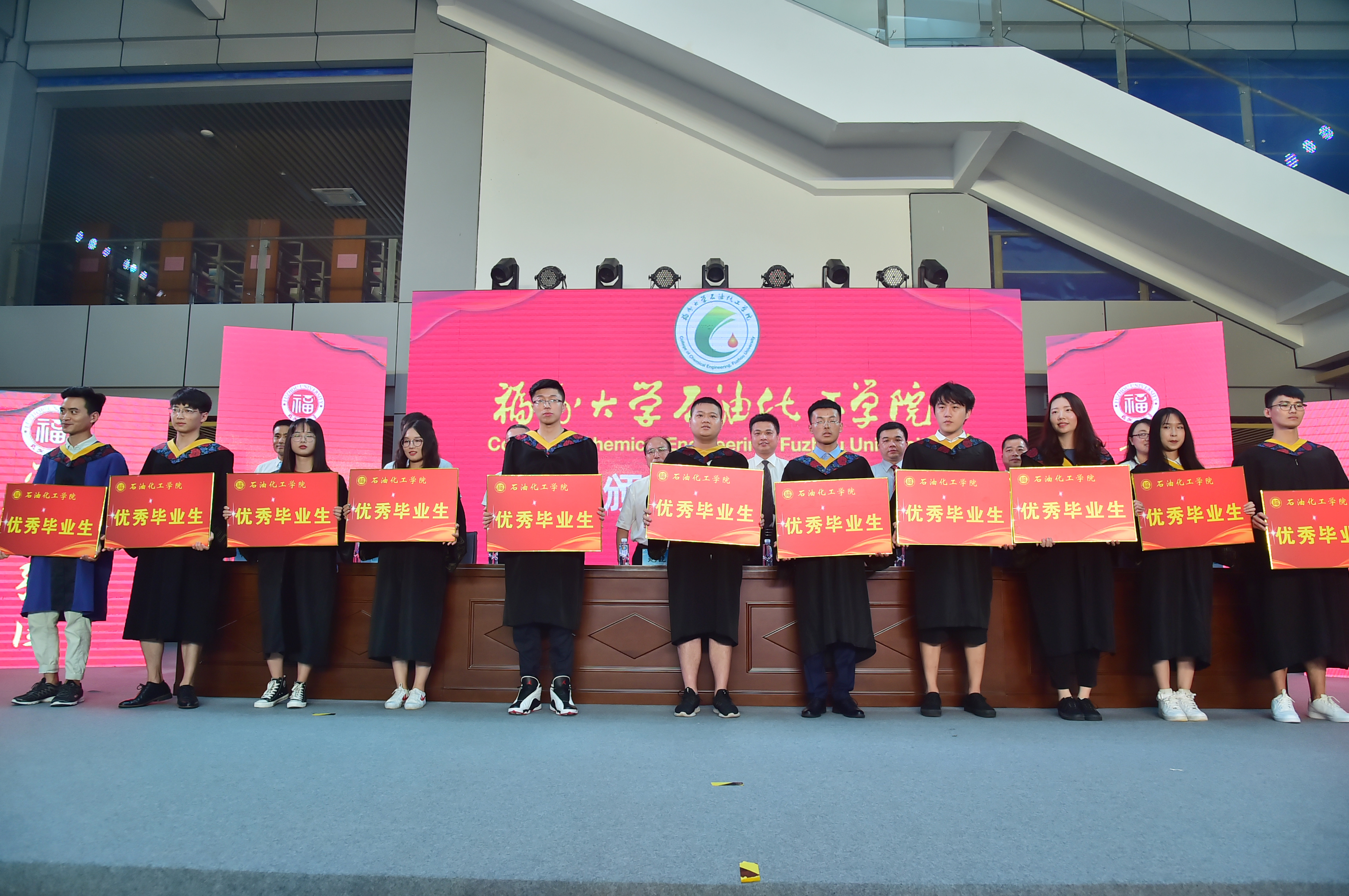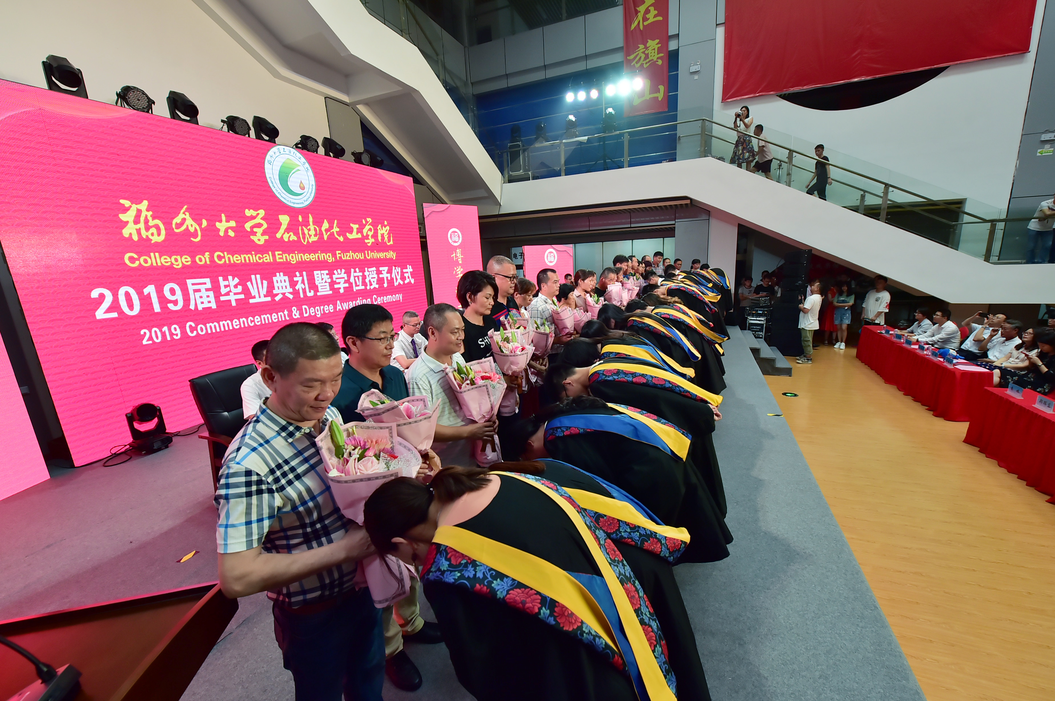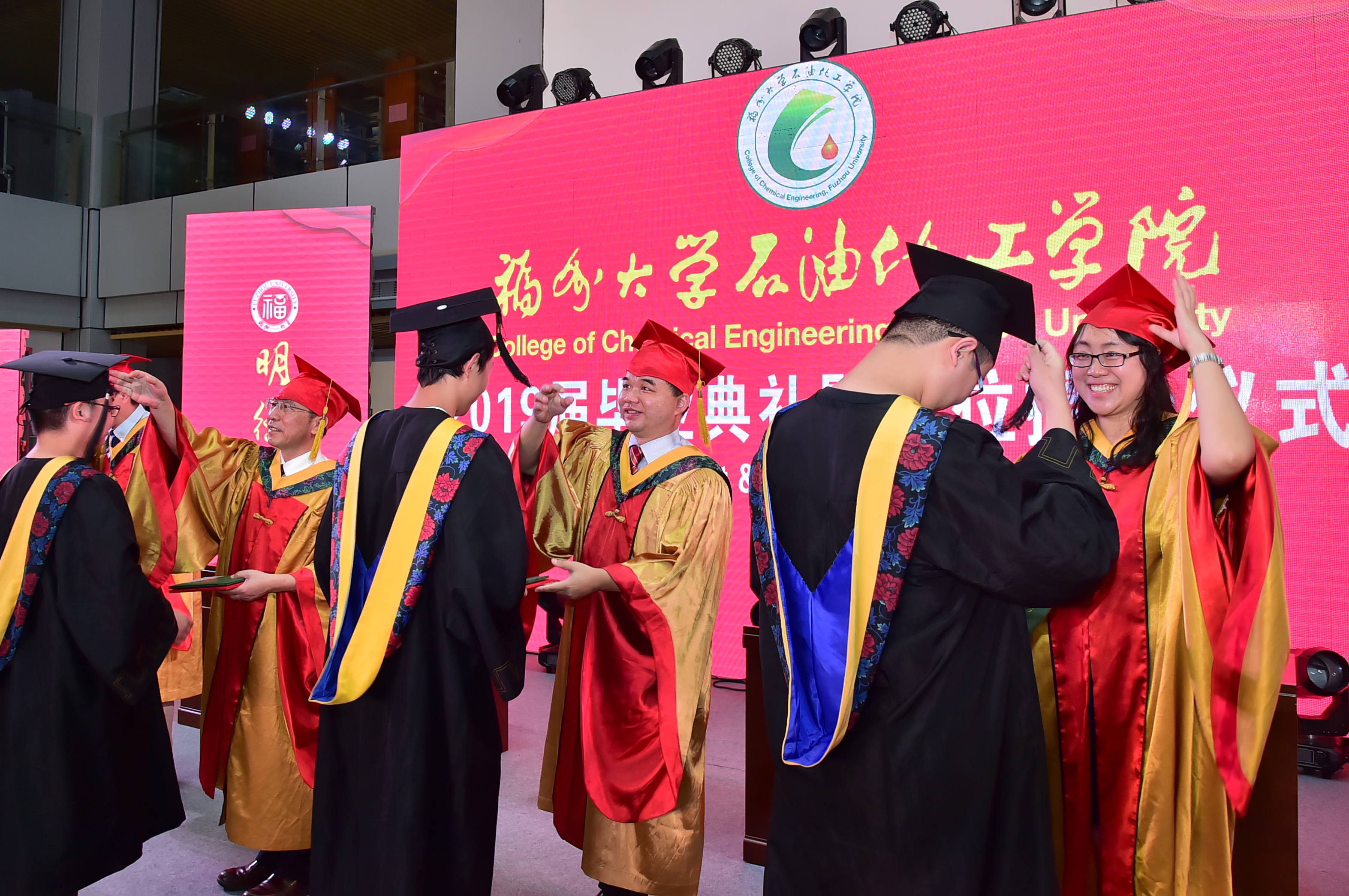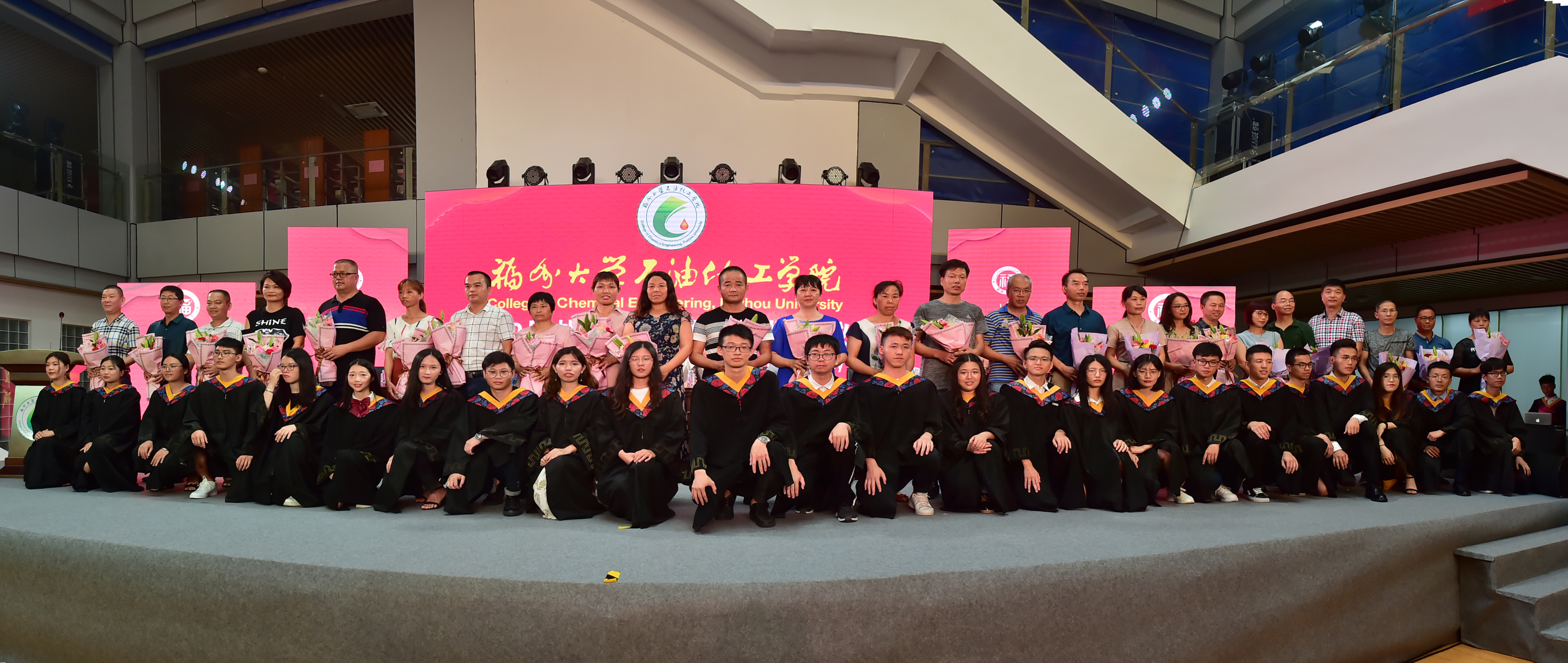 石油化工学院2019届毕业典礼暨学位授予仪式在泉港校区图书馆大厅隆重举办。会议分为“离歌奏响·硕果丰”、“前程似锦·恩情浓”、“立德树人·育英才”、“低语叮咛·候佳音”四个篇章。