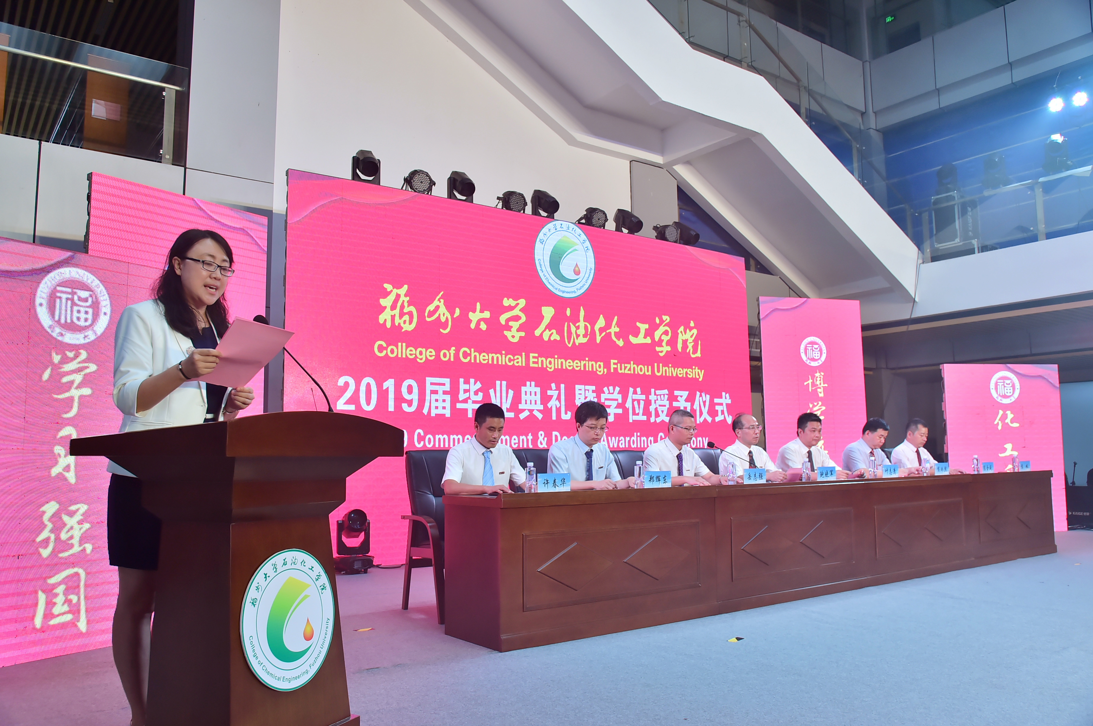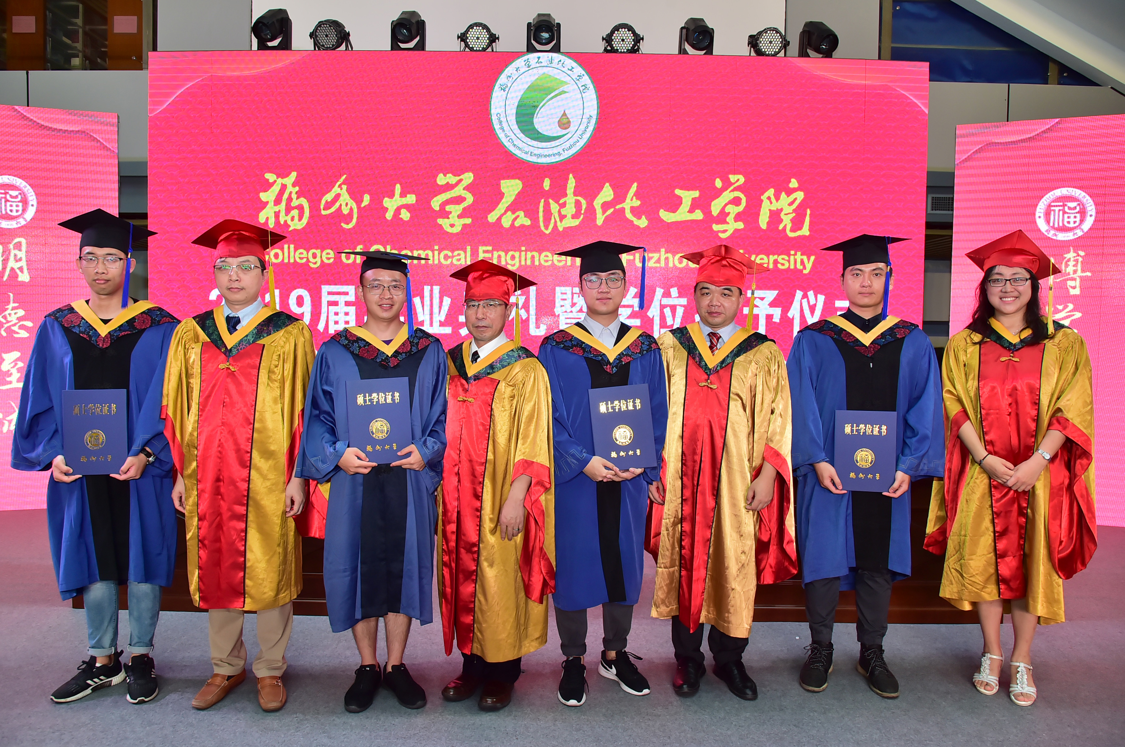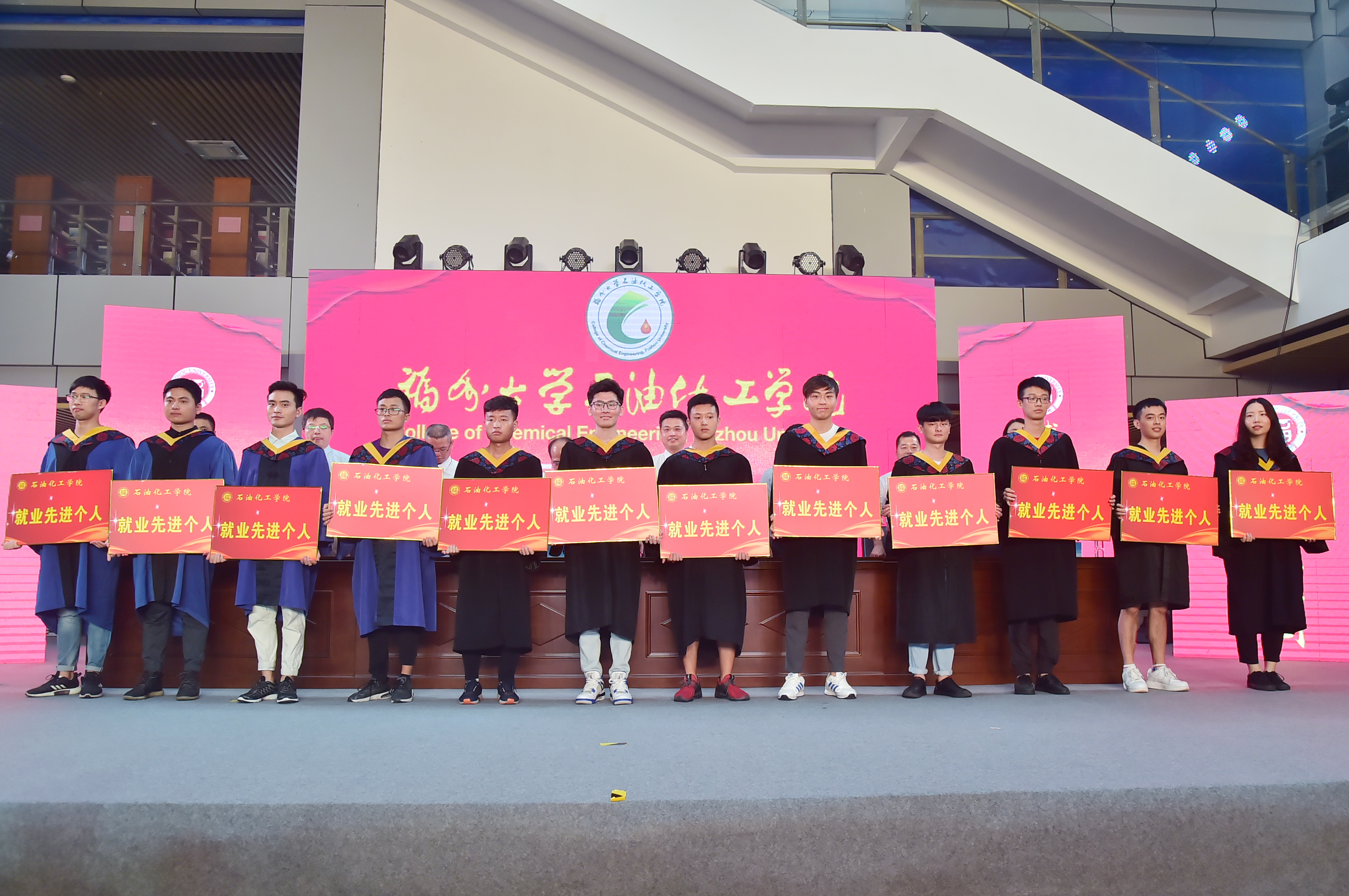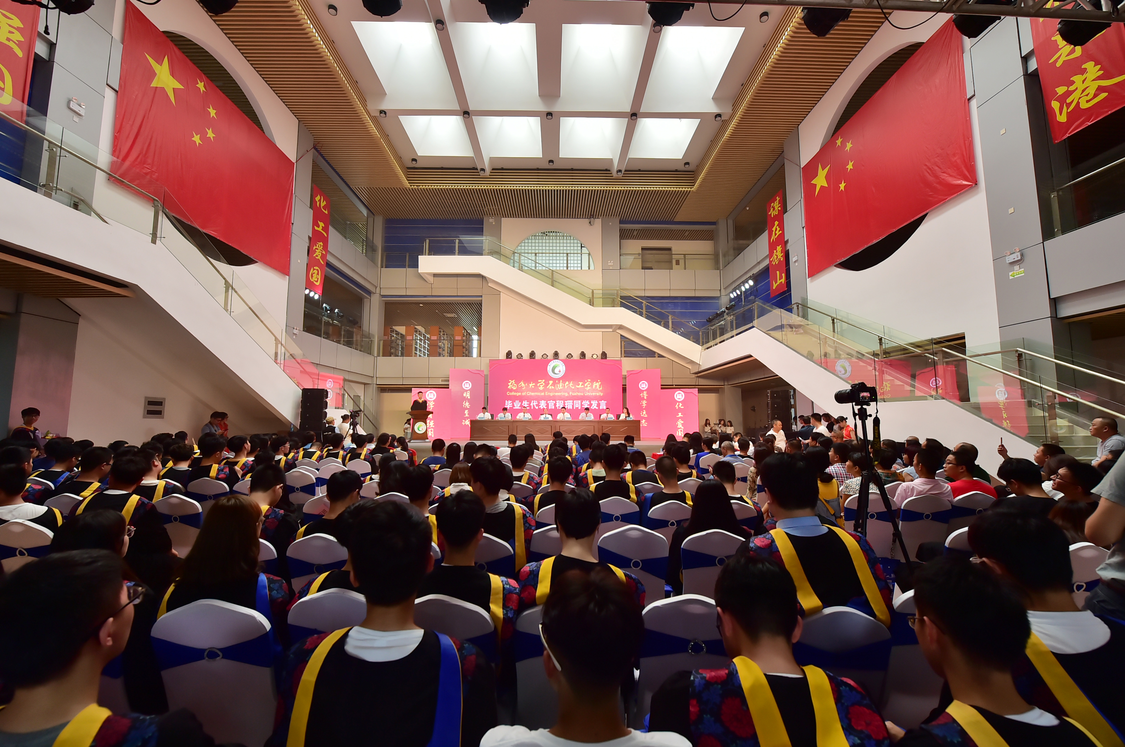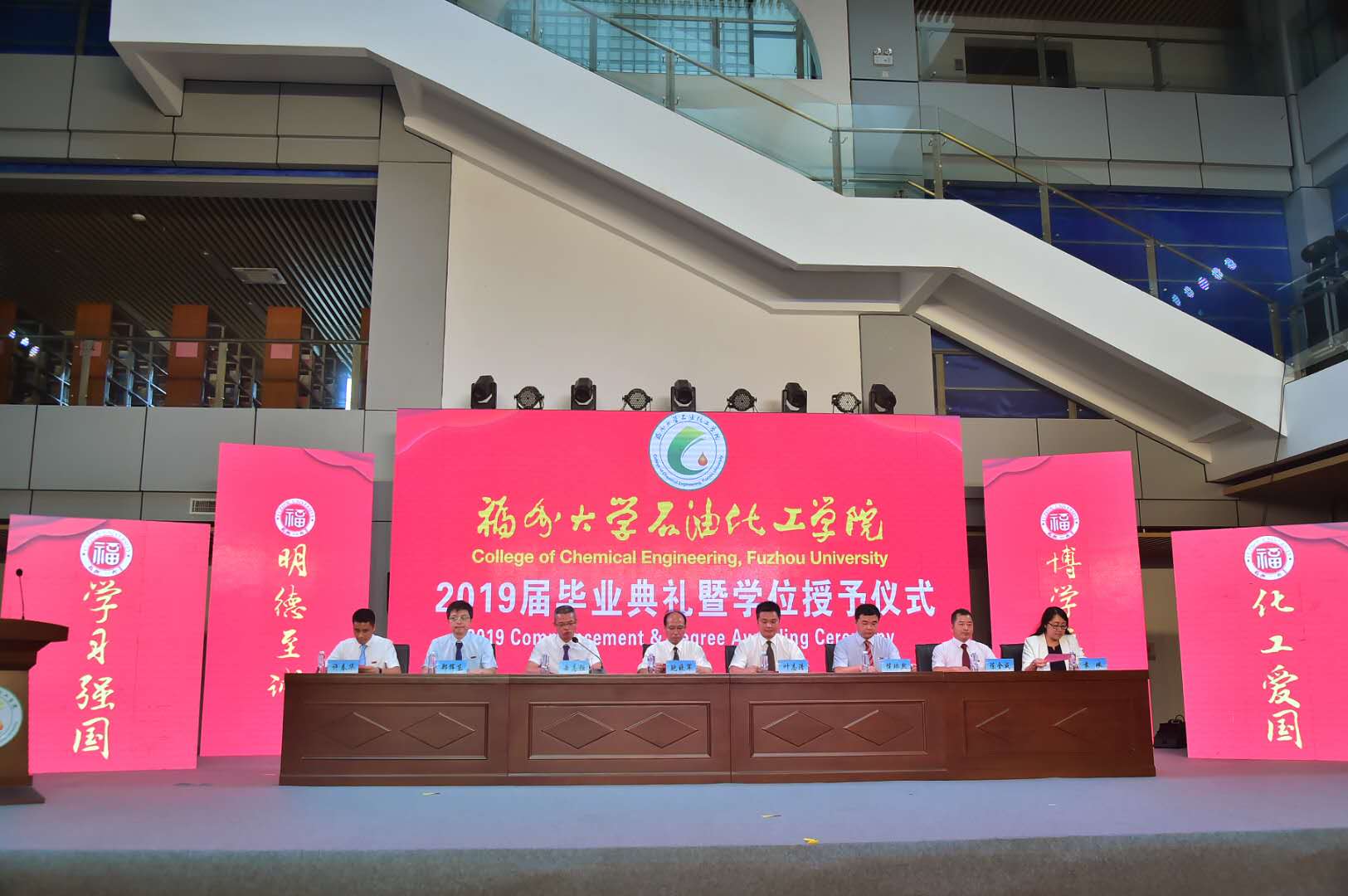 石油化工学院2019届毕业典礼暨学位授予仪式在泉港校区图书馆大厅隆重举办。会议分为“离歌奏响·硕果丰”、“前程似锦·恩情浓”、“立德树人·育英才”、“低语叮咛·候佳音”四个篇章。