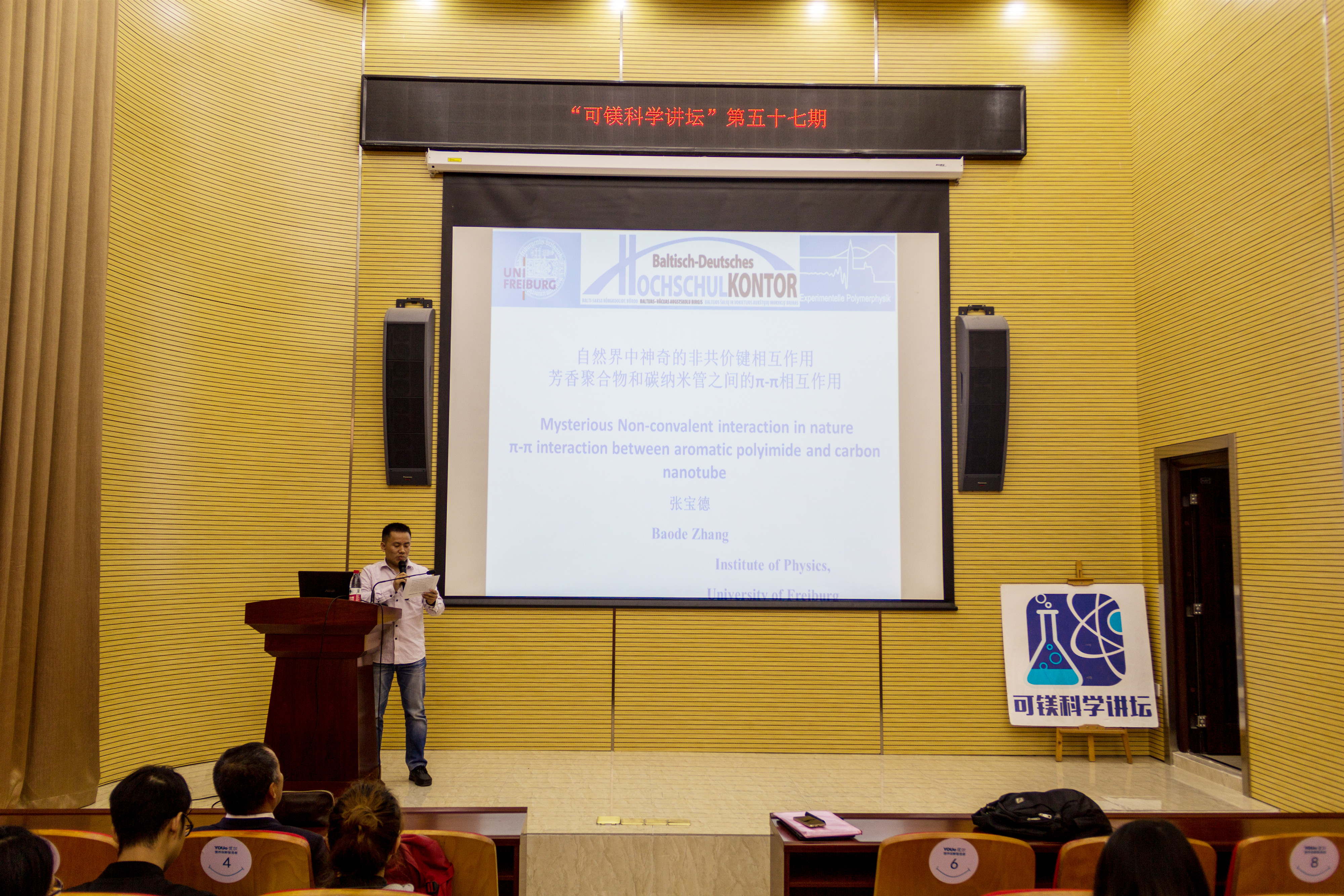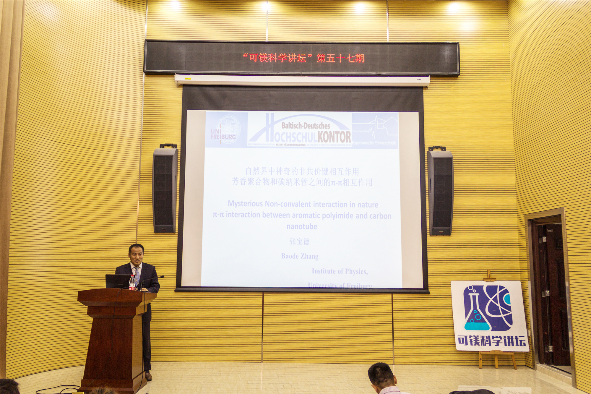 此次报告持续了近两个小时,张教授首先为我们详细讲解了大量存在于芳香化合物的π-π相互作用在超分子化学、化学催化、分子识别、自组装、药物插入等诸多领域的重要作用,随后又指出π-π相互作用的模型尽管已经提出将近30年,然而关于π电子云中色散、静电和泡利交换排斥作用对π-π体系整体几何稳定的贡献仍在探索之中。目前大多数π-π相互作用研究集中在相同分子之间的非共价键相互作用,而张宝德教授选取了不同分子,含六元环的碳纳米管和含芳香杂环的聚酰亚胺作为研究对象,探讨碳纳米管和芳香杂环聚酰亚胺间的π-π相互作用。张教授首先通过原位聚合法制备碳纳米管/聚酰亚胺纳米复合材料薄膜,由应力-应变力学性能测试、荧光光谱以及电子自旋共振等分析手段来揭示芳香聚酰亚胺在碳纳米管表面的优势构象,进而探索芳香聚酰亚胺和碳纳米管之间π-π相互作用。报告最后,张宝德教授同现场师生互动提问,积极讨论学术问题,加深理解,给在场师生留下了深刻印象。