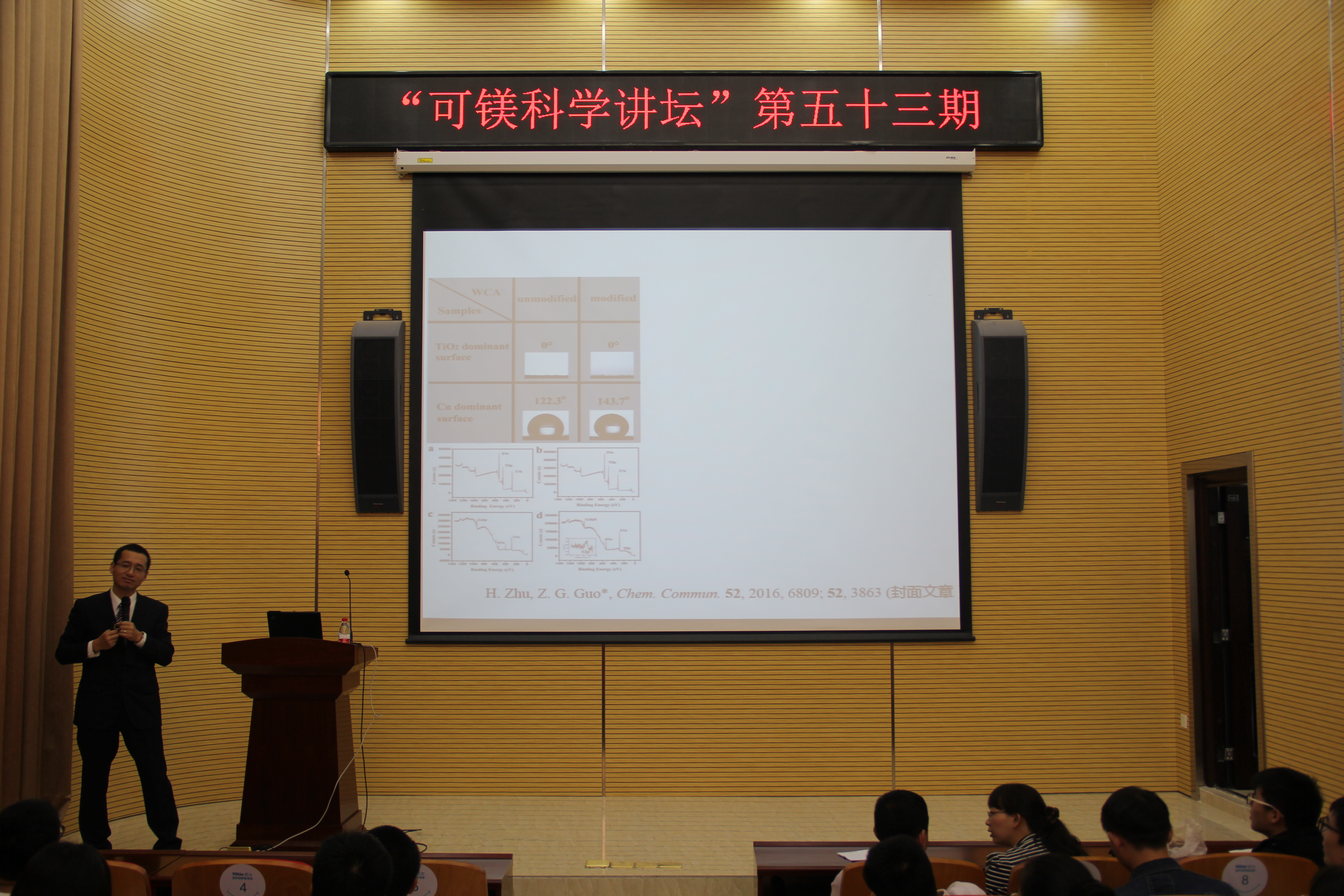 60周年华诞送上了诚挚的祝福,并亲切地慰问在场师生,受到了全场师生的热烈欢迎。郭志光教授主要从油水分离材料、水汽收集材料、块体耐磨自洁材料、超双疏材料等方面进行报告。首先介绍了仿生油水分离材料的研究概况以及在中国的发展,然后为大家介绍了其课题组在仿生油水分离材料上取得的突出成果,并列举了一系列应用案例及其优点,通过动态图,让同学们对仿生材料在油水分离过程中的工作原理有了一定的认识。而后,郭志光教授从油水分离应用的角度,阐述了超疏水表界面在生活、科学研究乃至工业生产中所具有极大价值的油水分离、微液滴操纵等功能。最后,在研究生培养方面,他结合自身的求学经历和与学生进行了互动交流,并对同学们提出了几点建议:希望同学在文献中提升自己,开阔自己的眼界;宽容对待别人;严格要求自己,勇于面对困难与挫折。同时也对在座的同学提出了四点希望:一是作为科研个体要保持好奇、热爱之心;二是作为生命个体要保持平等、敬畏之心;三是作为社会个体要保持谦卑、向上之心;四是积极面对人生中的任何困难,选择适合自己的人生道路。在座老师和同学深受启发。
