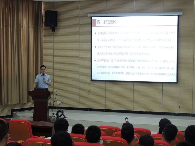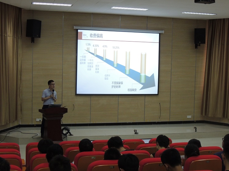 讲座初始,刘剑云讲师就向大家阐述了一些基本的金融知识和目前大学生的经济状况和消费状况,从而分析出当下网络贷款热门的原因所在。随后,老师给大家分析了网络贷款的还款机制,并指出其中存在的安全隐患与陷阱并结合实际案例为大家展现了因难以偿还网贷而发生的悲剧,呼吁同学们抵制不良网贷。
