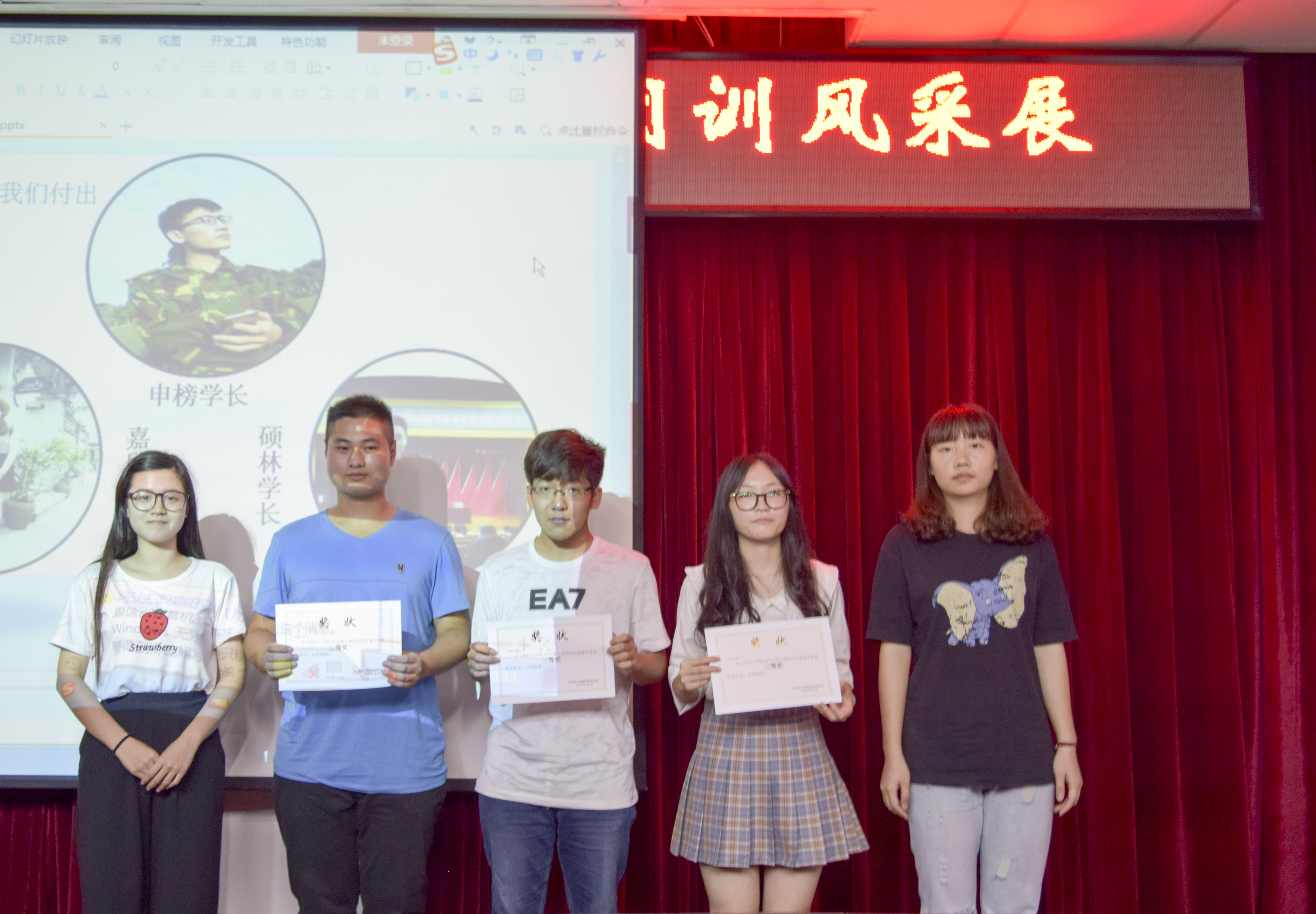 随着主持人甜美的声音拉开了风采展帷幕,各班心保依次上台,他们都制作了精美的PPT,还精心挑选了动听的音乐。心保们用PPT展示了团训活动的珍贵照片,当然各种接地气的表情包是必不可少的!每个心保都想在有限的时间内展现出班级团训最有趣,最感动的一幕!他们或卖萌,或自黑,或调侃班导再加之逗趣的照片和表情包,逗乐了全场观众和评委!大家都称团训为破冰之旅,介绍了自己班上同学如何从陌生人变成一个大家庭的家人,每个心保也道出了所有16级新生的心里话——感谢班导,班导们辛苦了。整个会场严肃又活泼,有搞笑又有感动,所有观众都一直保持着高涨的情绪!活动最后由学生会副主席马雯斐发表评价,她肯定了各位心保的表现,也在一些细节方面给出了建议。