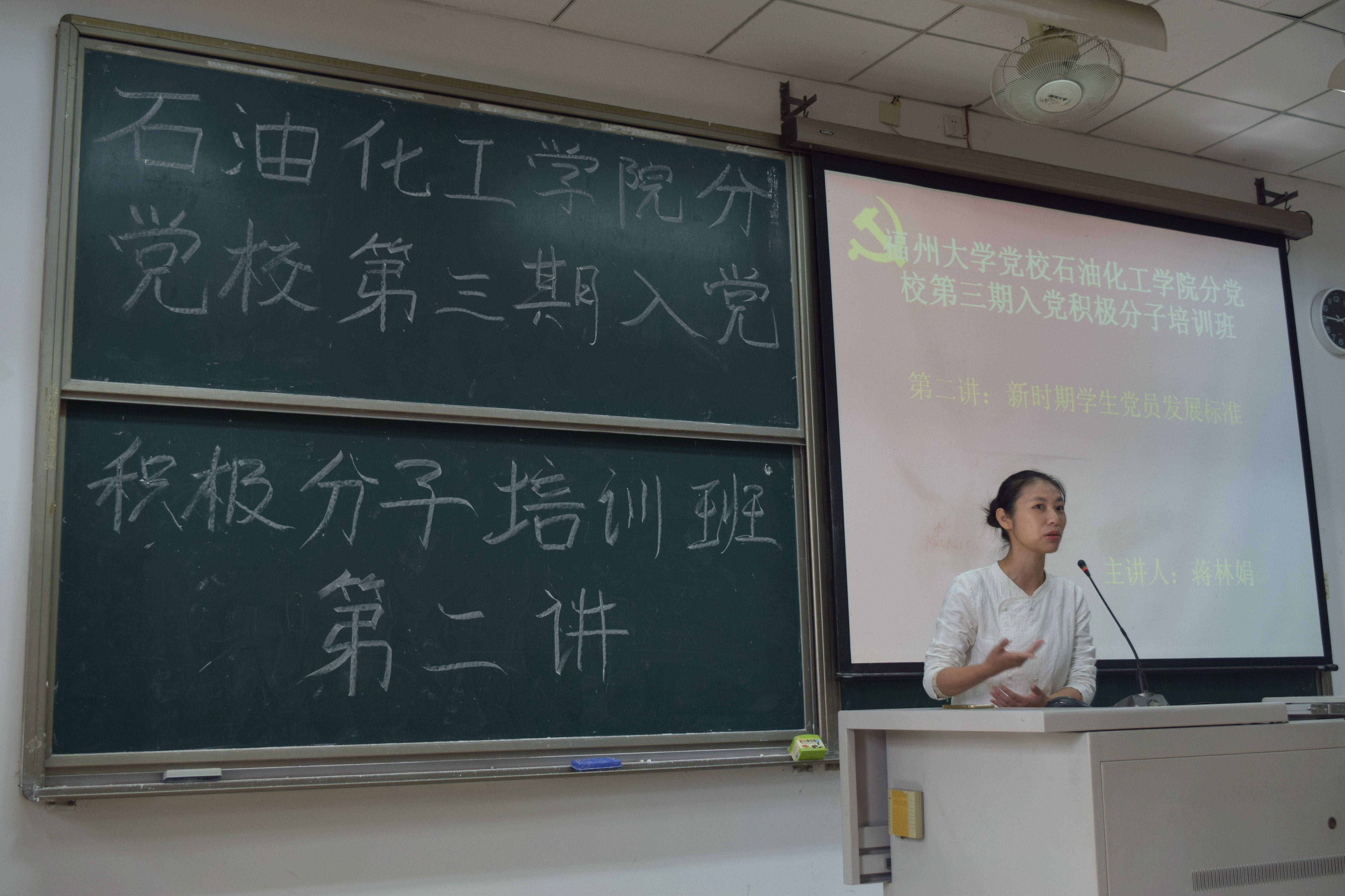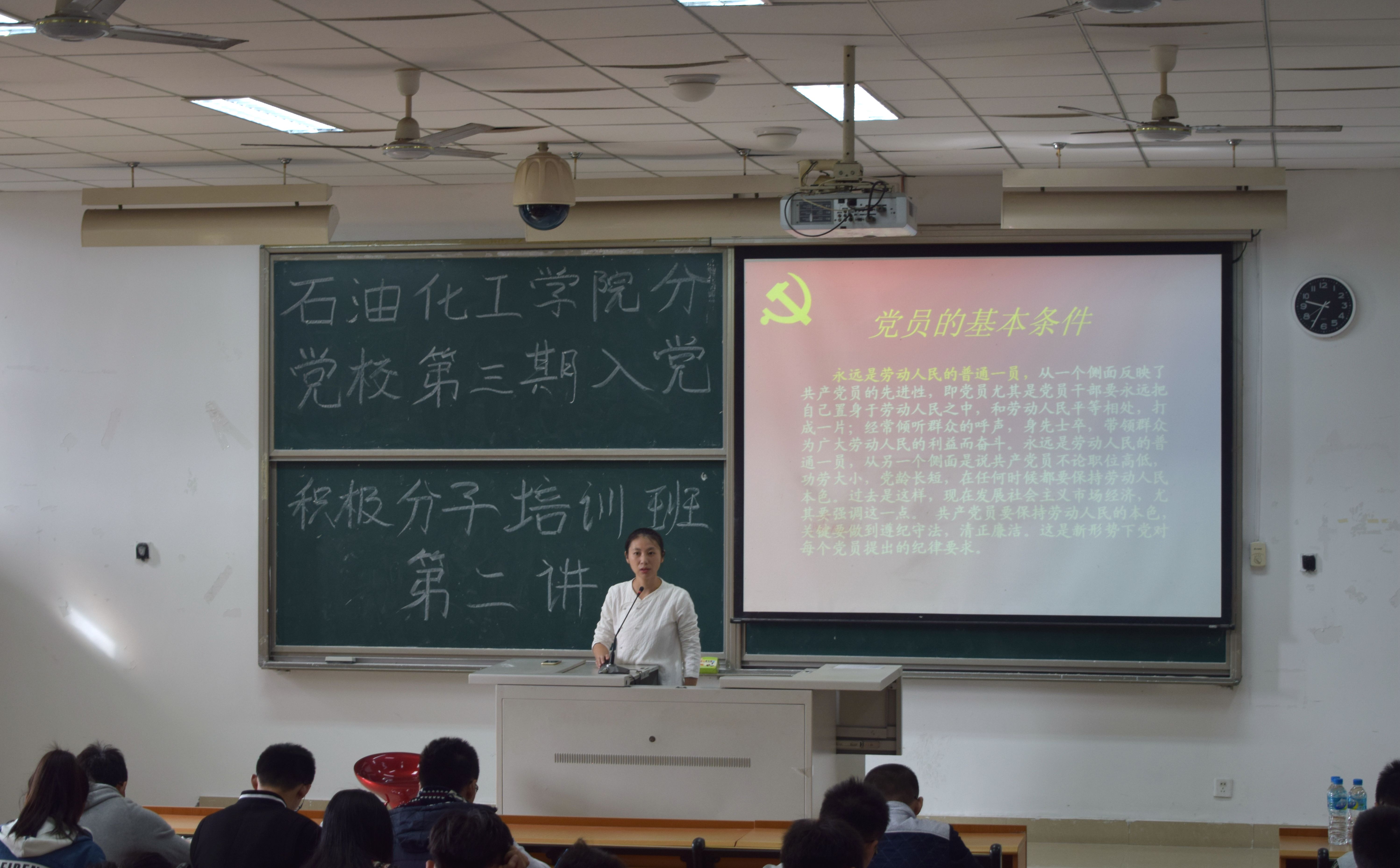 2016年11月13日上午,石油化工学院分党校第三期入党积极分子培训班第二课开讲。本次的主讲人是石油化工学院团委书记蒋林娟老师,她以“新时期学生党员发展标准”为主题开展讲座。