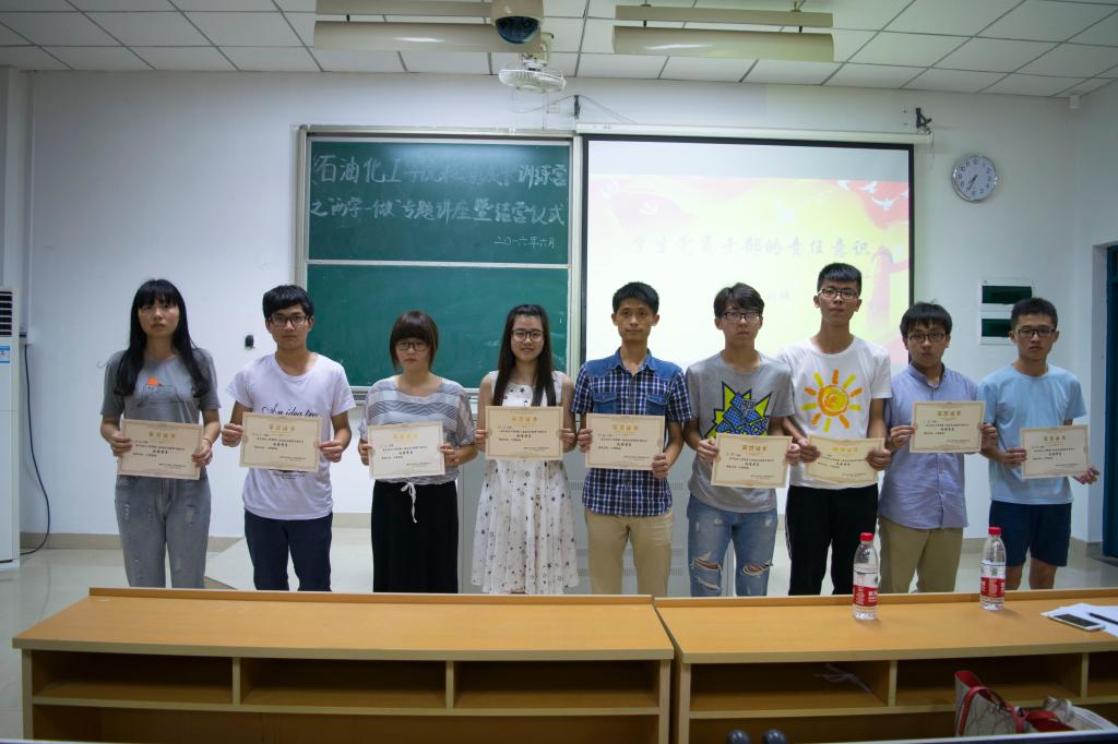 首先,刘玮老师就学生党员干部的责任意识发表演讲。刘玮老师强调学生干部应摆正态度,认清自我的角色,先成为一个合格乃至优秀的学生,其次才成为一个好的学生干部。刘老师阐明,学生干部首先应有良好的时间规划能力,付出比常人更多的时间和精力去协调好学习和学生工作之间的关系,而不应当把学生工作繁忙作为成绩下降的理由。其次作为学生干部,应注重责任意识的培养,具备服务同学的奉献意识,提高团队协作和分工协调能力。学生干部应谦虚亲和,亲历亲为且掌控好全局。最后,刘玮老师和蒋林娟老师颁发了优秀学员证书和学员结业证书,全体人员进行了合影留念。