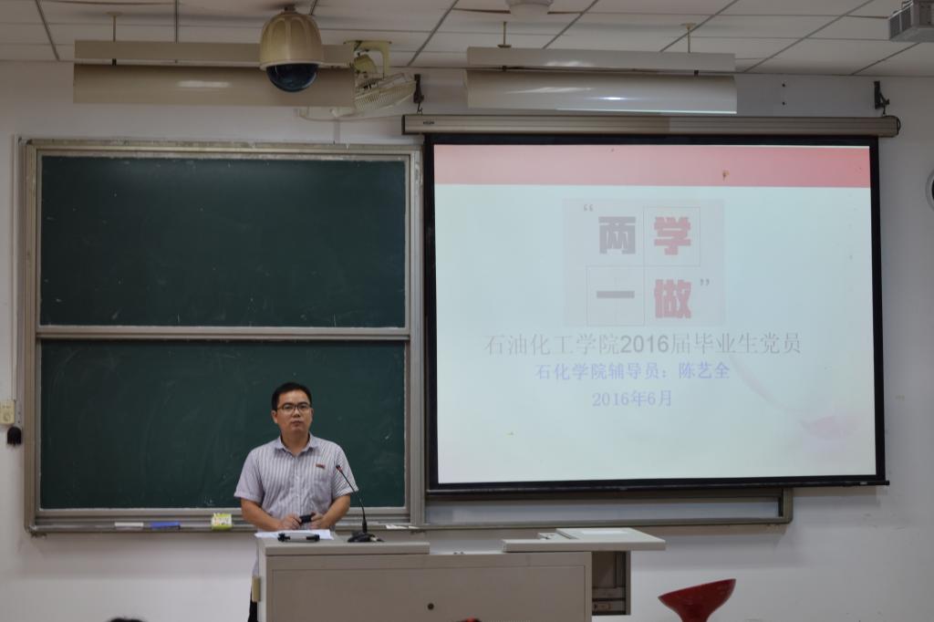 为深入开展党员教育,推动各项工作的开展,石油化工学院于6月12日上午8点45分,在文楼—104开展了毕业生党员离校教育。本次会议的主讲人是2012级辅导员陈艺全老师,石油化工学院2015届全体毕业生党员参加了此次会议。