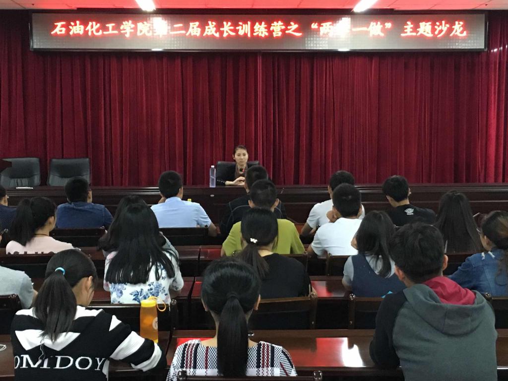 石油化工学院团委书记蒋林娟老师,在嘉锡楼413报告厅为成长训练营成员开展讲座——学生干部如何实践“两学一做”,帮助学生平衡学习和社会工作的关系,从而更好的发挥学生干部党员、积极分子的先锋模范带头作用。