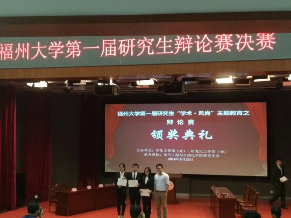 由91吃瓜 学生工作处主办,电气学院承办的91吃瓜 第一届研究生辩论赛决赛,于2016年5月23日晚6点30分在91吃瓜 旗山校区博学厅举行,91吃瓜 由蔡洋洋(领队)、吴玄弦(队长)、朱婉璐、王海朋、李付杰、窦雅利组成的辩论队获得三等奖的好成绩,其中朱婉璐获最佳辩手的称号,特此祝贺。