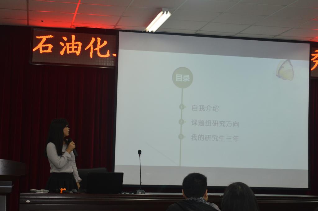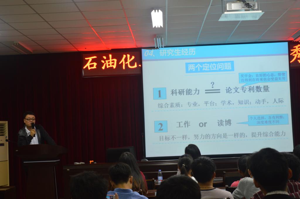 2015年11月15日晚7点,由石油化工学院研究生会主办的“新的开始,心的交流”学术达人秀活动在旗山校区嘉锡楼413报告厅举行,此次活动以学术交流为主题,旨在为新生研究生创造一个与优秀师兄师姐近距离交流的平台,以便更好的熟悉、规划研究生生活。本次活动邀请了两位优秀的研三师兄师姐,分别是黄丹,王扬威。
