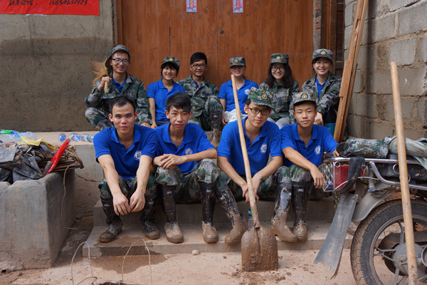 10点整,全体志愿者整装待发,一小时后到达天马村。看到天马村到处淤泥堆积、下水道堵塞、灾民出行不便的情况,带队领导立即分配工作任务,开展救灾工作。实践队队员帮助村民清理淤泥、搬运受损家具,同时安抚村民情绪。