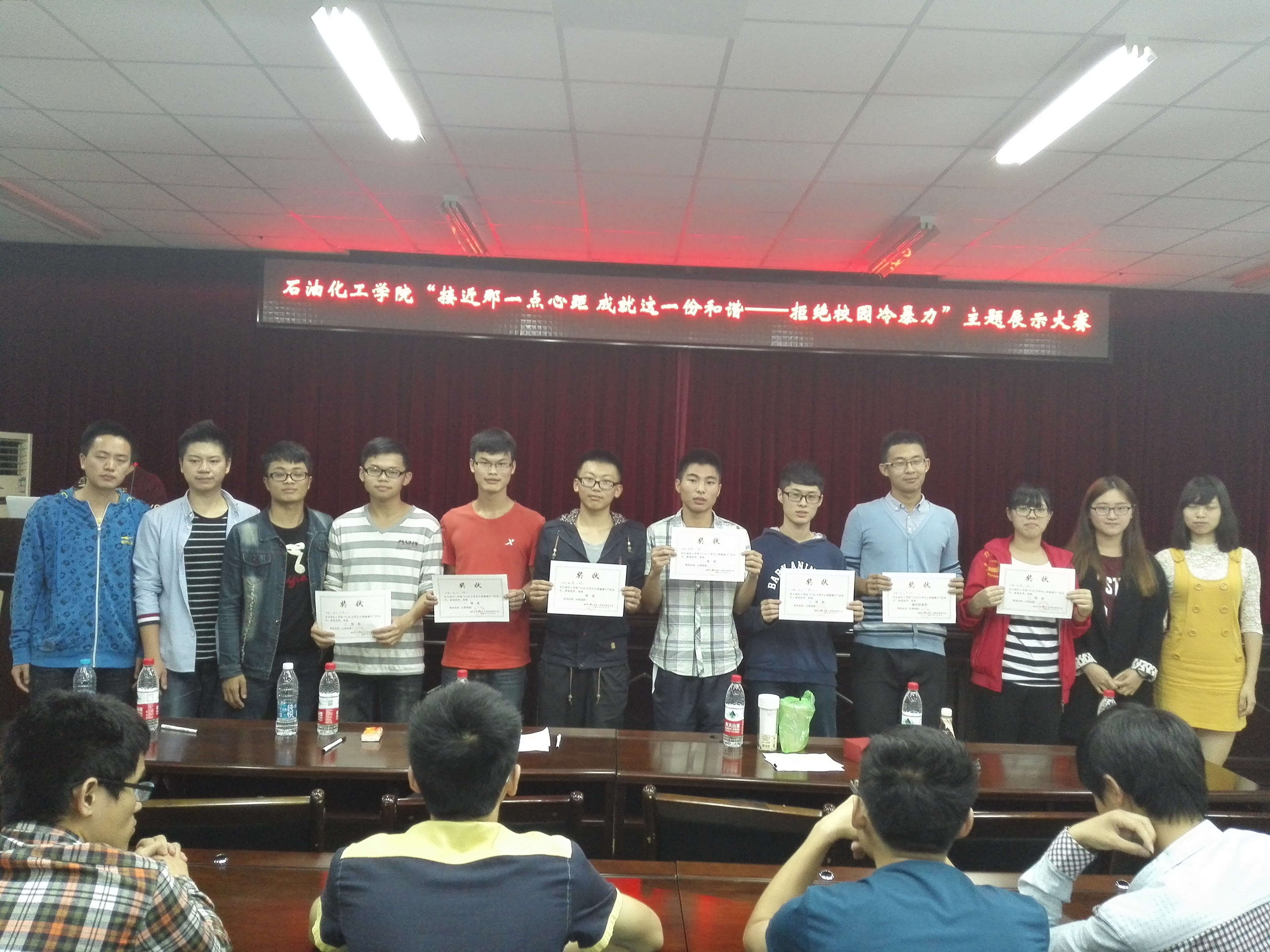 5月23号晚7点于嘉锡楼413,由石油化工学院主办的“接近那一点心距,成就这一份和谐——拒绝校园冷暴力”PPT风采展大赛正式开幕。莅临本次风采展的评委有石油化工学院主席李炜,副主席林方泽,副主席张莉荃,心理部部长王细辉,以及特邀评委化学学院副主席郑清。