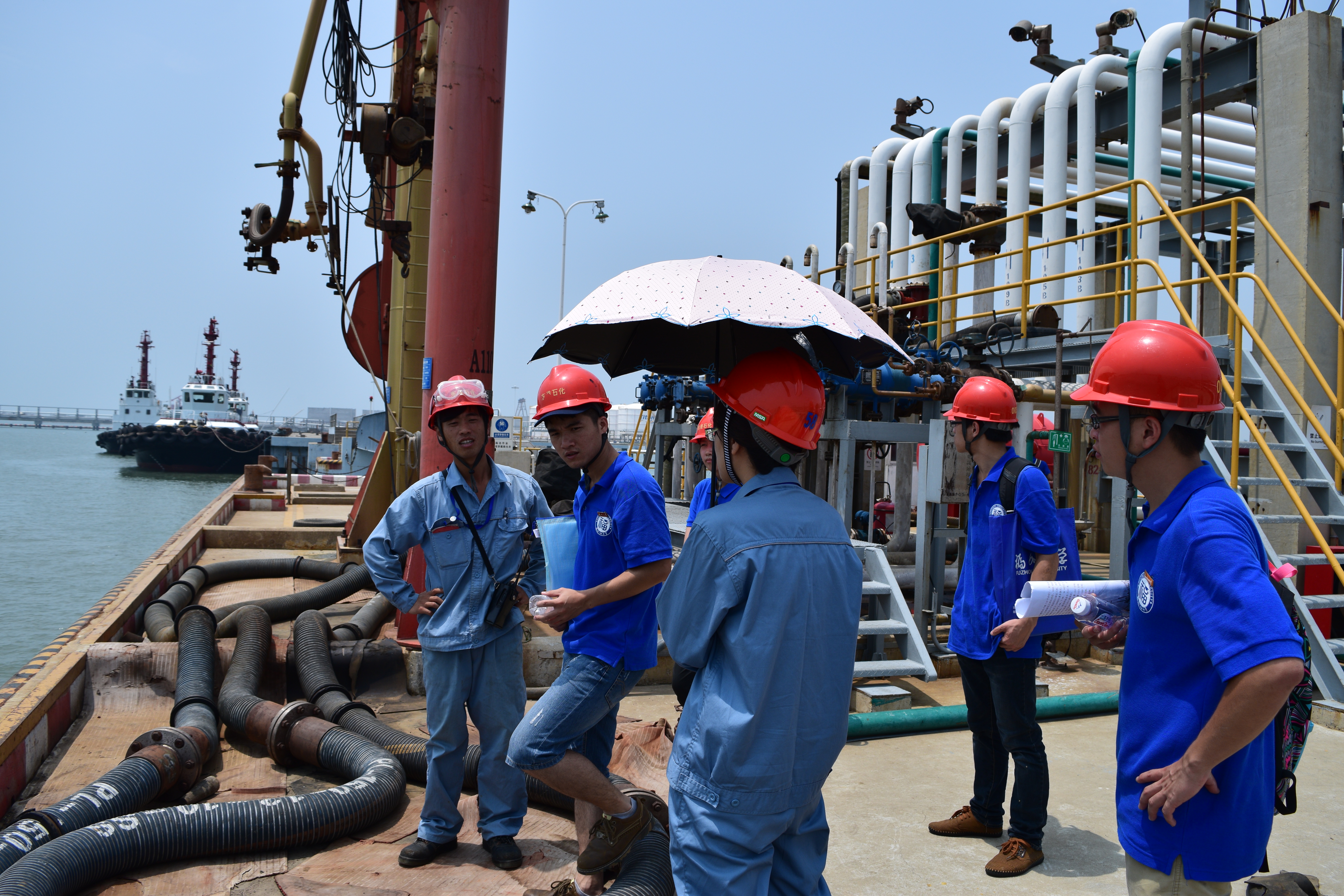 随后参观的福建东港石油化工实业有限公司是一家提供仓储物流服务的现代化石油化工库。博士实践团抵达公司后,在工厂班长的带领下对工厂进行了参观。首先实践团抵达控制室,参观到码头管线紧急切断阀控制系统、储管监测系统等实时监控系统,之后深入工厂,参观到了盐酸储罐,实地了解到污水处理站中污水历经集水、水解酸化、好氧池、二沉池、污泥浓缩池、活性炭吸附及最后的化验分析等步骤。 “我们也在考虑实现公司的多元化发展,争取取得更多的项目方向。”由此可见,新兴企业要谋求发展,就要实现多元化,而多元化的方向,将更加依赖新一代人才的建设。