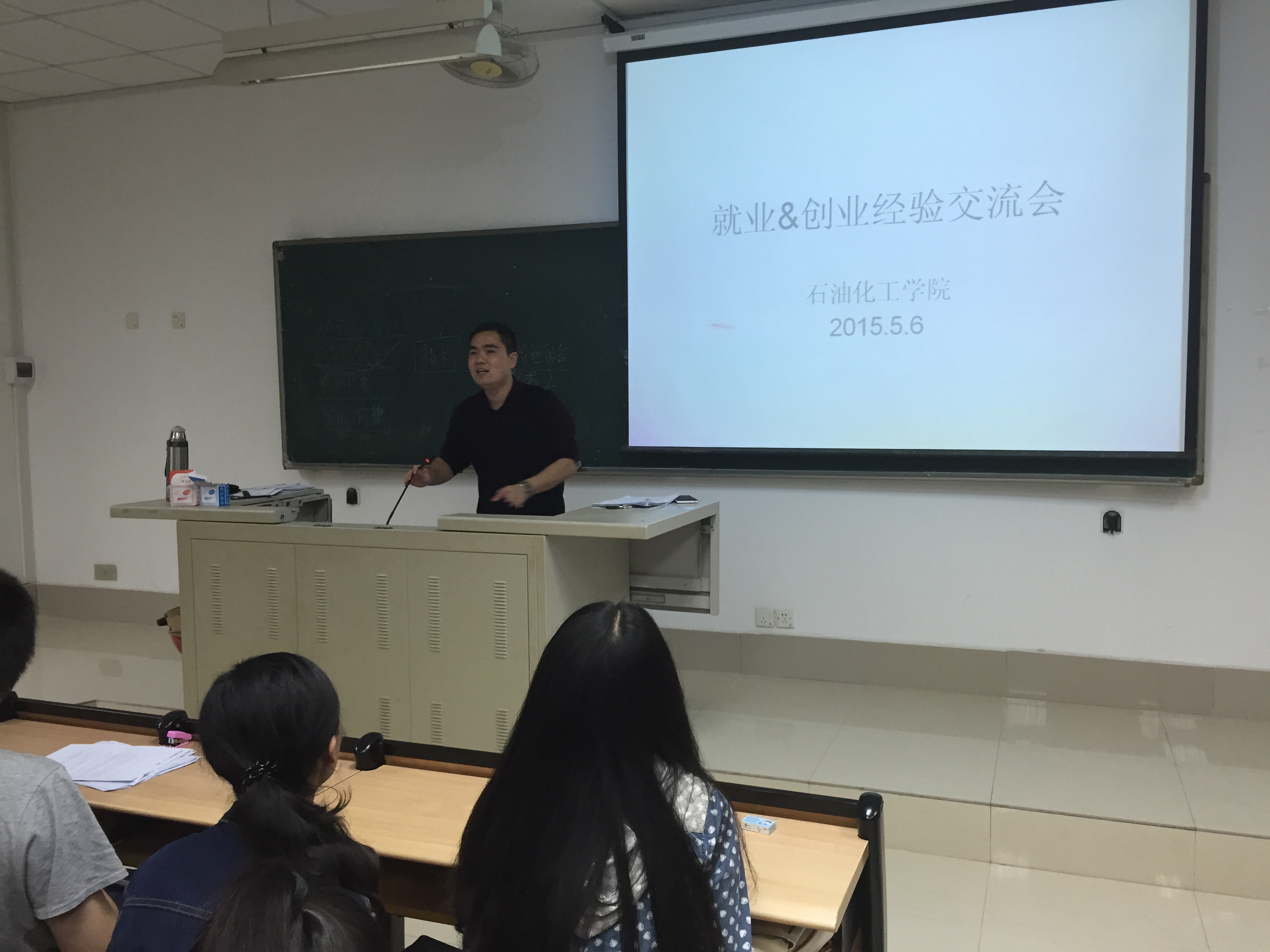 2015年5月6日晚上,石油化工学院在西1-506举办了第一届 “就业&创业”经验交流会。出席本次交流会的嘉宾有2011级辅导员陈艺全老师,2011级的杜成翔学长和陈俊达学长,2012级全体同学参加了本次交流会。