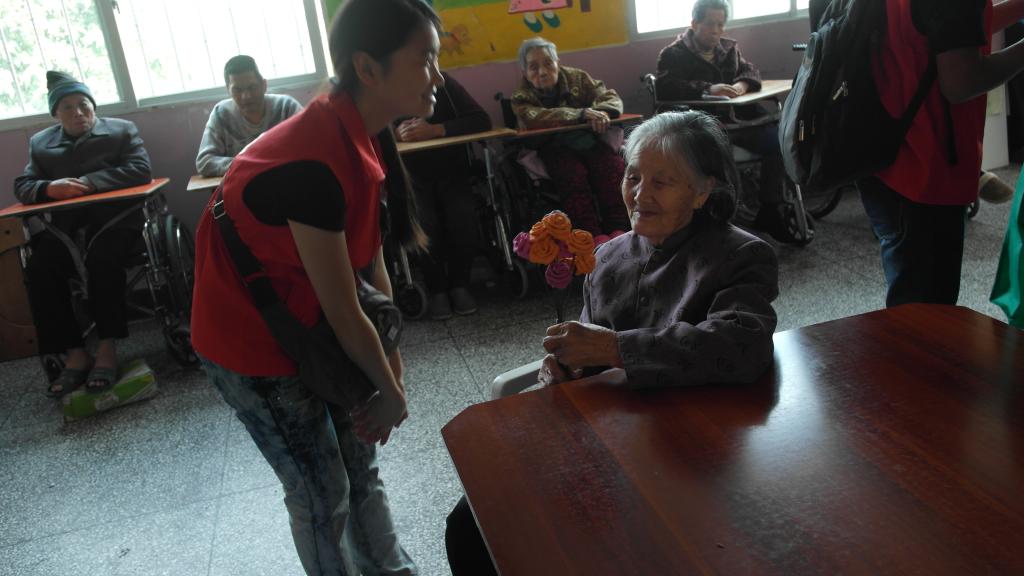 再一次来到敬老院的同学们和这里的老人们多了一丝亲切感,友善地和我们的老人们聊起天来。为了给老人们带来欢快的表演和保证微电影的拍摄,同学们在一旁排练起了节目,只为了展现最好的一面给我们可爱的老人们。活动开始,志愿者们首先带来了热力四射的舞蹈----小苹果。欢快的舞蹈带来的是无限的青春与活力。活动间隙,志愿者们去探望了几位因行动不便而无法来观看表演的老人们。虽然看不到精彩的表演,但志愿者的到来依旧给这些老人们带来欢笑。最后,志愿者带来了一首老歌---甜蜜蜜,真心祝愿我们的老人们都能拥有甜蜜蜜的生活。同学们还献上亲手制作的玫瑰花,表达志愿者们的一片心意。
