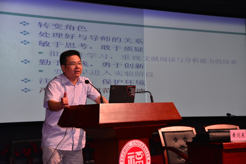 黄剑东老师以《给研究生新生的几点具体建议》为主题,结合自身教学管理经验,从六个方面深入浅出地向新生同学们讲述了如何处理好研究生学习过程中的几个问题,如何在研究生学习中做好科研,如何成为一名合格的研究生等问题。第一,做好角色转变。“师傅领进门,修行在个人”,做研究不能等、靠、要,要学会主动寻求解决问题的思路。第二,要处理好与导师的关系。应当重视沟通能力的培养,适应老师的指导风格。第三,要敏于思考,敢于质疑。重视文献阅读与分析能力的提高,积极开展批判性学习。第四,要勤于实践,勇于创新。科学研究需要动手,应当把握机会,尽早进入实验阶段。第五,要注意安全,保护环境。注意他人的安全、自己的安全以及实验室的安全。第六,要遵守学术规范和道德。杜绝学术造假行为,不存侥幸心理。最后,黄剑东老师祝愿新同学们都能学业有成,健康快乐!