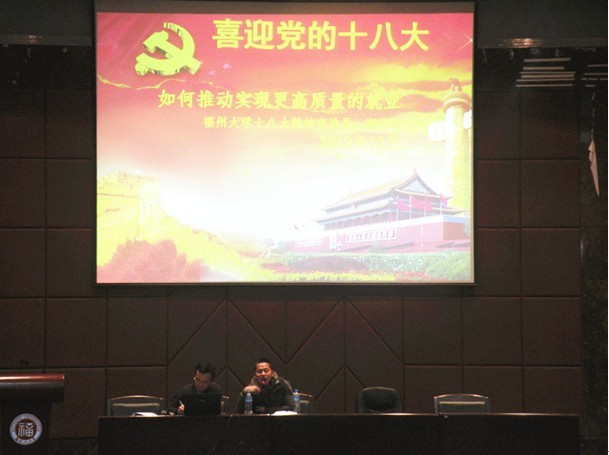 为了深入学习贯彻十八大精神,宣传和发扬十八大精神,12月11日晚由化学化工学院2012级段会主办,2012级化学类2班承办的 “十八大宣讲会——推动如何实现更高质量的就业”宣讲会于嘉锡楼一楼报告厅隆重召开。本此宣讲会面向2012级全体本科生,各班同学积极参加,辅导员鼎力 支持。活动邀请到电气工程与自动化学院的郑伟彬学长担任主讲,化学化工学院学生会主席林伟主持本次报告会。