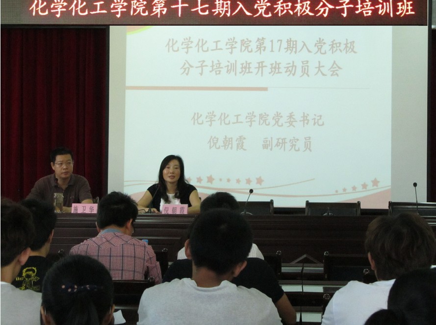 2012年10月13日上午9点,化学化工学院第17期学院分党校于嘉锡楼413开班。出席本次分党校开班仪式的有学院党委书记倪朝霞老师、院党委副书记施卫华老师、10级辅导员朱振宁老师以及11级辅导员华琴老师。首先,党委书记倪朝霞老师致开幕词,她对前来参加培训的积极分子表示热烈欢迎,向学生们阐明了学院分党校培训的目的与意义,并对新学员们提出了三点希望与要求:第一,把握机遇,勤奋学习;第二,突出重点,讲究方法;第三,坚持宗旨,创先争优。希望新学员们能珍惜这每一次的学习机会,并在今后的学习中不断提高自己,争取早日成为一名合格的共产党员。最后倪书记预祝此次培训会取得圆满的成功。