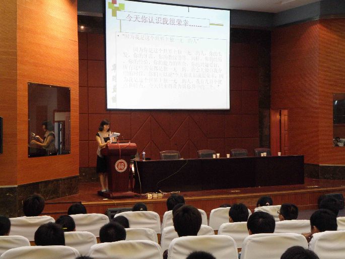 陆老师富有激情的语言和极具亲和力的笑容让近300位新生听得津津有味,收获颇丰。首先,陆老师告诉大家的是应该如何珍惜这宝贵的大学时光,成为一个好的时间管理者,分清事情的轻重缓急则是很重要的一点。大学是一个展示自己的舞台,是一面认识自己的镜子,也是一家琳琅满目的超市,大家各取所需,大学更是一座待开采的宝矿,我们要学会不断地修正自己各方面的能力,把握每一个自己的“第一次”,珍惜每一个自己的“最后一次”,为自己将来的职业发展不断探索,努力开创自己历史的新乐章。演讲的同时不时有掌声雷动,而让现场气氛推向高潮的是互动环节,陆老师让新生自愿上台自我介绍,“今天你认识我很荣幸……”,在陆老师以自己作为例子自我介绍完毕后,同学们就争先恐后地往主席台狂奔而去,先后共有分别来自全国各地的7个新生勇敢地上台让大家认识了他们。新生们可爱生动的语言惹得台下掌声此起彼伏。