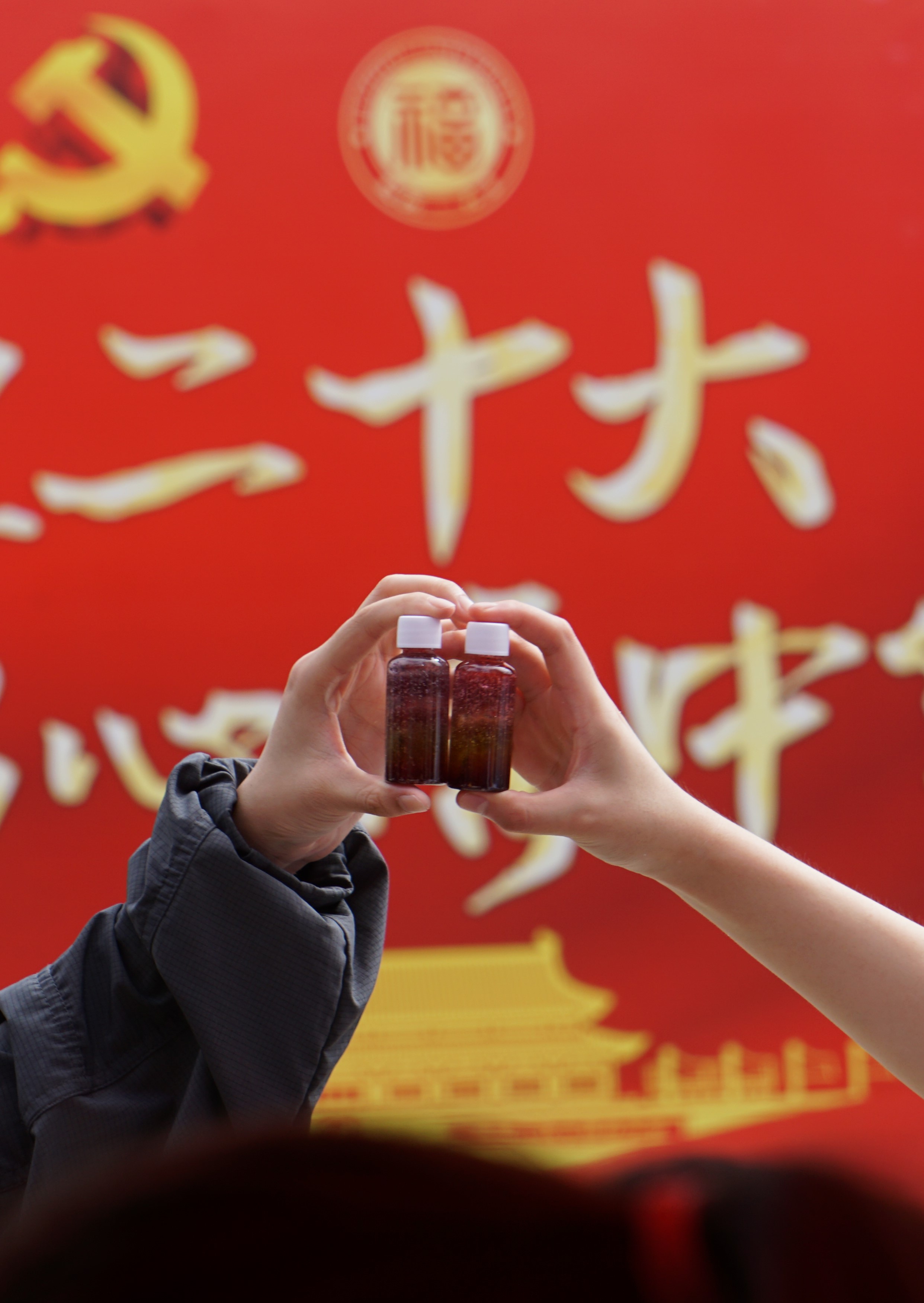 院团委书记伍宇翔为黄身勇书记展示蓝瓶子