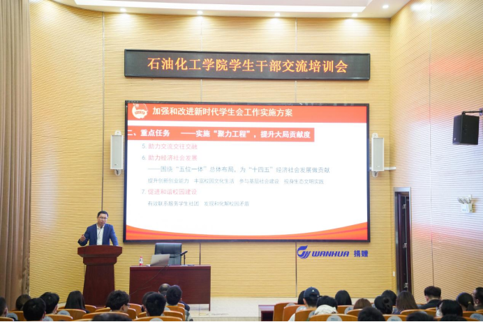 于泉港楼优尔报告厅召开学生骨干培训动员会。本次会议由院团委书记伍宇翔主持,院党委副书记林航为同学们做“全心全意为同学服务——加强和改进学生会工作”专题培训,学院旗山校区和铜盘校区近百名学生参加培训。