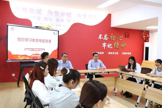 博学苑A区“一站式”社区党校讲授党纪学习教育专题党课,25号楼楼层指导员、化学学院张金水副院长与谢在来副院长,25号楼兼合党支部书记王洪春以及楼宇学生党员代表共同参加此次专题党课。