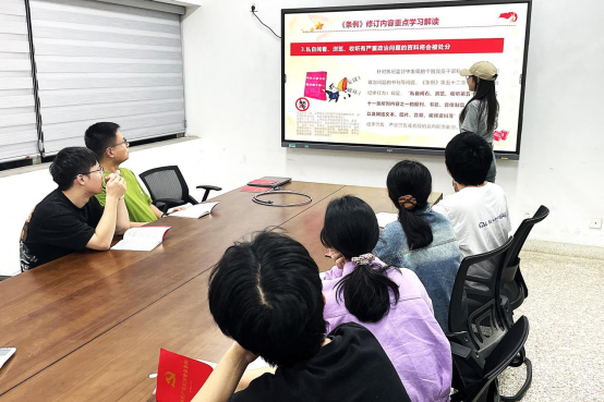 2023级研究生化工过程强化党支部以“深耕党纪学习,增强纪律意识”为主题开展微党课。支部书记带领党员集中学习了《条例》修订重点,深入了解党内法规制度相关规定,全面掌握党的纪律规矩,深刻领会党纪学习教育的重要要求。之后通过观看《条例》解读视频、知识趣味问答、党员分享心得等环节让党员们领悟到一个百年大党是如何做到时刻保持清醒与坚定的,也意识到作为当代青年只有把纪律学习摆在更加突出位置,才能更好地为全面推进中国式现代化贡献青年力量。