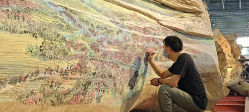 下午15时,实践队到达此行第二站——莆田美术馆,实地观摩郑春辉师傅与其他木雕手工艺者现场雕刻工的艺作品——巨型木雕《京杭大运河》。