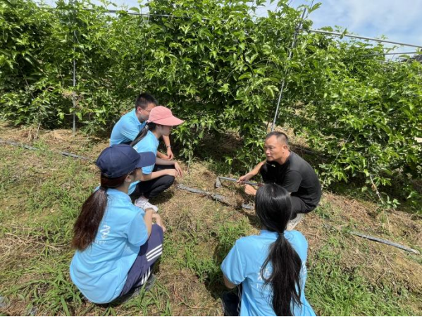 7月12日实践队来到永泰百香果种植基地。去年实践队就走进三叶珍馐种植基地,开展了土壤检测并有针对性进行化肥改良;今年实践队根据土质情况和果树生长特点,通过添加微量元素、控肥、释肥,带着“定制螯合肥”再次来到基地,调研果树生长情况和土壤状况。