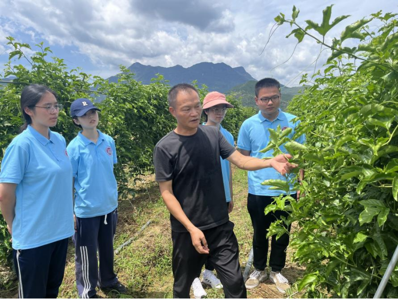 实践队来到三叶珍馐种植基地,映入眼前的百香果树郁郁葱葱、硕果累累。在听取农户对今年果树生长情况和果实品质的介绍,在得到今年百香果产量和品质较往年有了大幅提升后,实践队员非常欣慰。