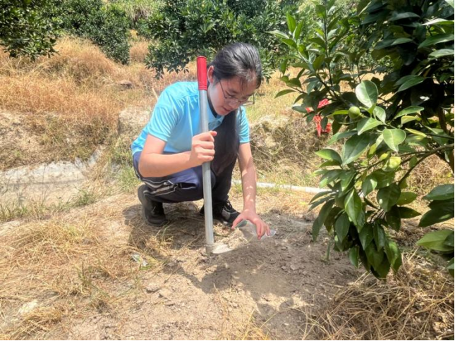 实践队将本次参观霍童古镇文化长廊和闽东国共第一次和谈的旧址的收获和体验转化为实际行动,前往霍童镇外表村,顶着烈日对橙子种植地和茶树种植地进行实地考察和土壤采样,同时也为农户送上“定制化肥”并为果树施肥,在乡间地头开展了一堂“劳动实践”的思政大课。定制的螯合肥料不仅为果树提供了生长所需的关键养分,促进了果实的饱满与甜美,提高了产量和品质,同时也保护了土壤生态,改善了土壤肥力,为乡村振兴注入了源源不断的科技动力。