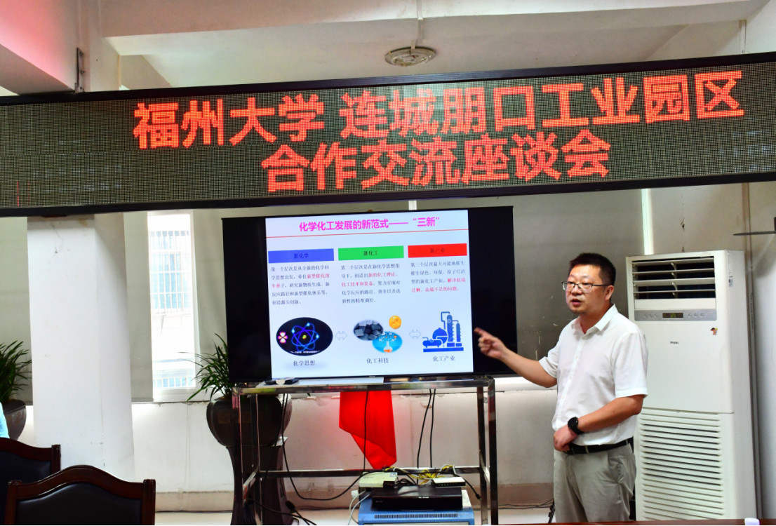化学学院副院长谢在来介绍化学学院基本情况、课题组的研发方向以及应用场景,希望能够为园区企业提供定制化的实验方案,转化科技成果及技术,精准服务国家重大战略和福建现代化产业发展需求。