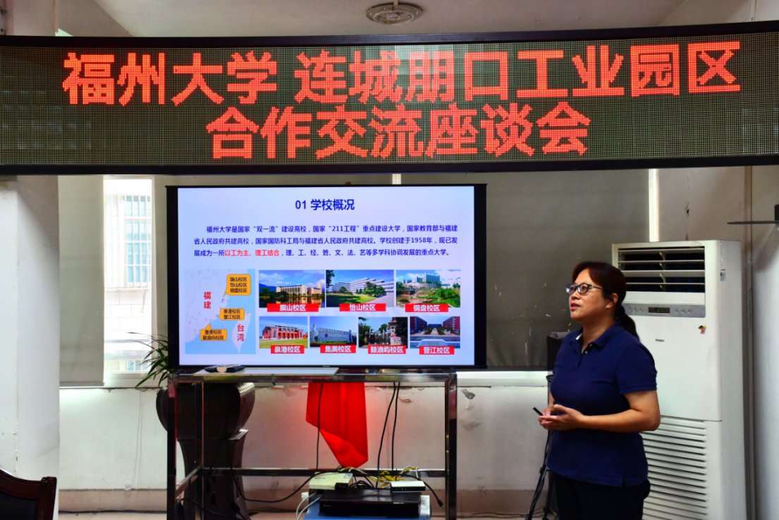 李玲副院长介绍学院有特色,高水平,研究型,国际化的办学特色,分享了学院的科学研究、科研成果、科研平台等实验支持条件。她表示学院将推积极响应国家号召,推动学院科研成果转化为企业生产的新质生产力,愿同企业一起培养专业型人才,助力朋口工业园区和园区企业蓬勃发展。
