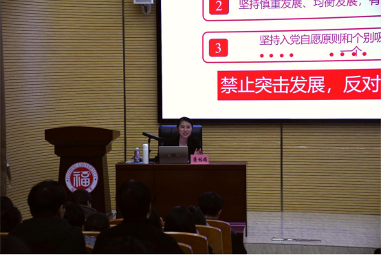 最后,蒋林娟老师对在座同学寄予厚望。她勉励大家要持续提高政治觉悟和理论素养,紧跟党的步伐,认真学习党的先进理论,定期向党组织汇报思想情况,以实际行动接受党组织的考验,用不懈的努力和坚定的信念争取早日成为一名合格的中国共产党党员。