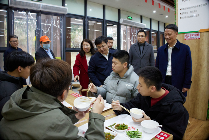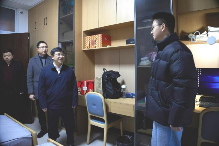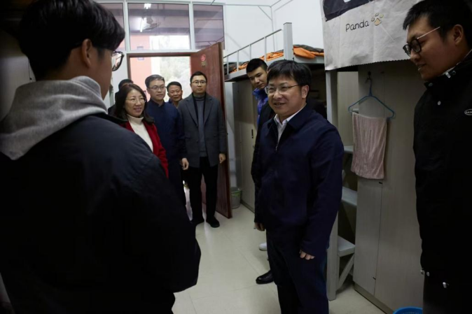 走访学生宿舍期间,江副校长与同学们亲切交流,关心询问同学们的学业发展、科研实践、生活保障等,勉励同学们要努力学好本领,把学习成果转化为服务地方发展的实际行动。在医务室,江副校长详细查看了接诊记录台账,并重点检查药品储备管理情况,要求健全应急医疗预案,强化药品的管理和监督,切实保障师生健康权益。江副校长还深入食堂调研指导,并与就餐师生亲切交谈。他要求校区管委会要严格落实食品安全主体责任,为师生构建安全卫生舒适的就餐环境。