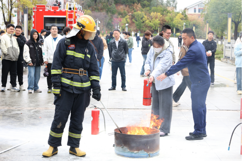 随着急促的警报声响起,演练正式开始。在工作人员的组织和引导下,正在教学楼学习的师生紧急撤离建筑物,大家低姿捂鼻,迅速穿过烟雾,按照预定路线有序撤离至安全区域。随后开展的消防安全知识培训中,前黄消防中队陈助理通过案例讲解消防知识,指导师生现场体验使用灭火器扑灭初期火情。