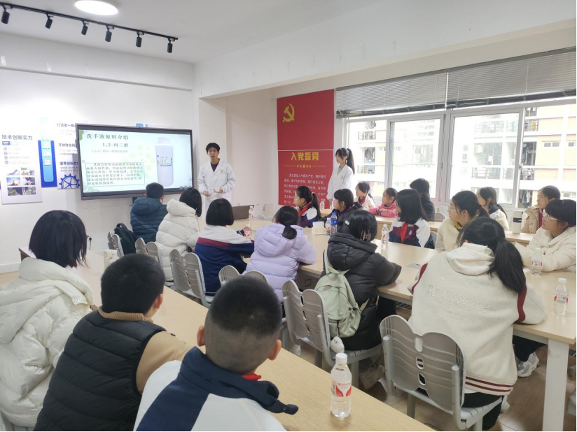 化工学院志愿者以“化工与生活”为切入点,深入浅出地解析表面活性剂原理及环保型洗手液配方设计,结合“绿色化工”理念,强调可持续原料在工业生产中的核心价值。讲座通过生动案例与互动问答,激发青少年对化工科学的兴趣。
