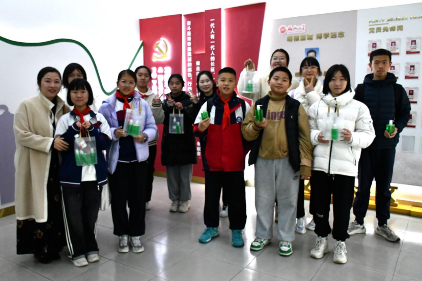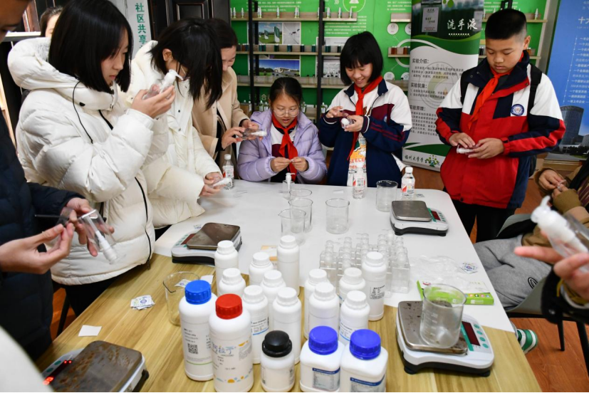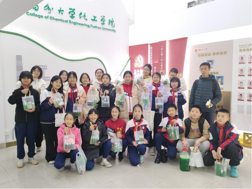 化工学院的志愿者们通过趣味讲解和互动问答,向小志愿者们详细演示洗手液的制作步骤。随后,大家分组制作洗手液,一瓶瓶晶莹透亮的绿色洗手液,不仅是实践成果,更承载着“洁净双手,传递爱心”的公益理念。在"成果转化"环节中,小志愿者们兴奋地展示成果,并为洗手液贴上“化工学院-附属学校雷锋月特制”的爱心标签。这些承载科技温度的作品将送往附属实验学校的教室、食堂、体育馆等公共区域,成为校园健康防护的"爱心驿站"。