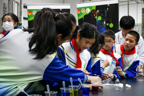 在化学化工国家级实验教学中心,同学们在志愿者们的带领下参观了实验教学中心并化身"小小化学家",通过趣味实验近距离感受化学化工的神奇魅力。