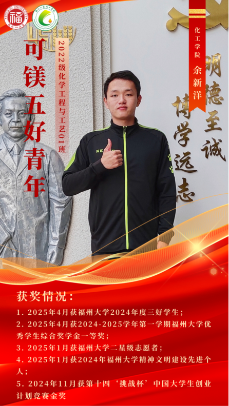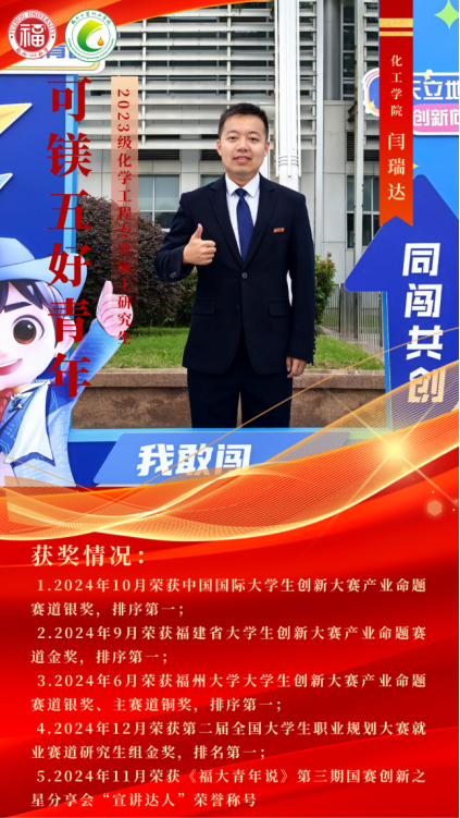 2024年他带领团队以双轮第一问鼎福建省大学生创新大赛(2024)金奖,并斩获中国国际大学生创新大赛(2024)国赛银奖,实现化工学院产业命题赛道国家级奖项“零的突破”。