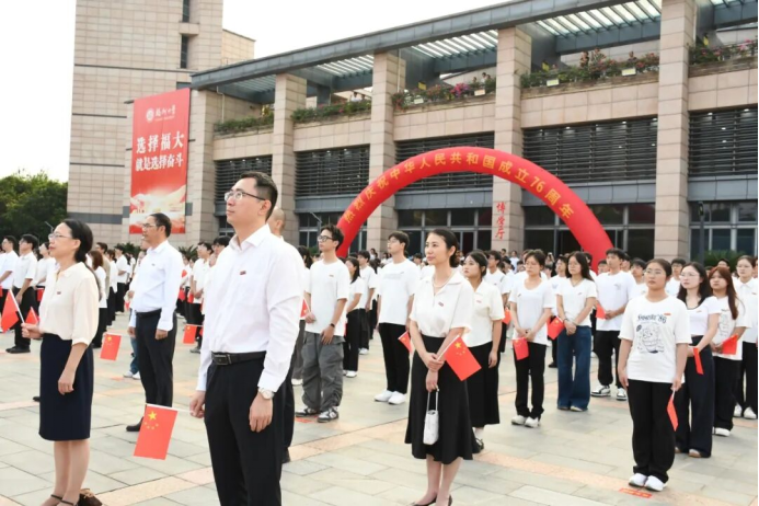 各校区用一场庄严的升国旗仪式,向中华人民共和国76周年华诞致敬。校领导、机关及学院负责人与师生代表齐聚,共享这一神圣时刻。化工学院师生代表在旗山、泉港、怡山、铜盘四校区同步参与,激昂的国歌回荡校园,五星红旗迎风升起,全体人员肃立注目,把对伟大祖国繁荣昌盛、人民幸福安康的深切祝福,寄托在这面飘扬的旗帜上。